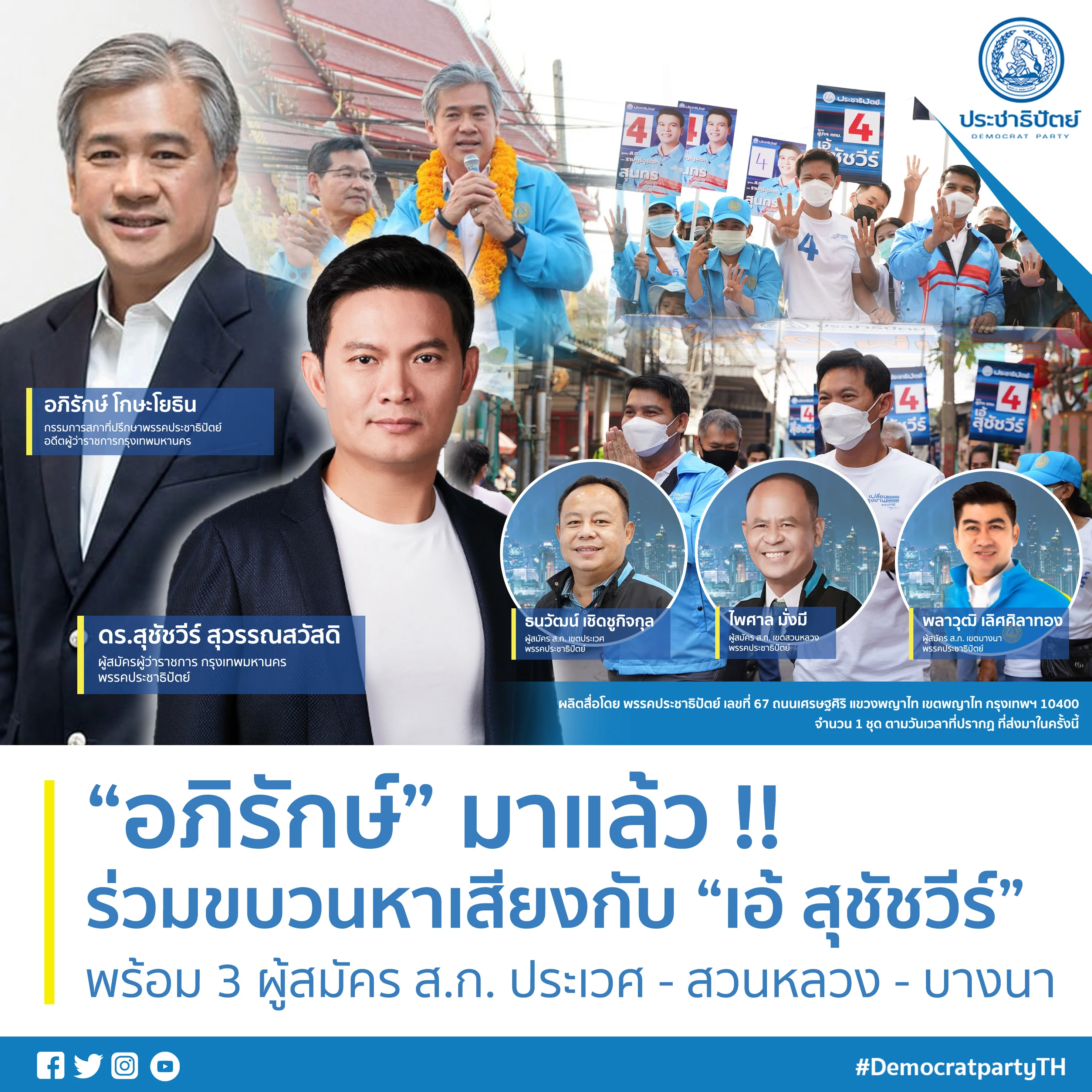 วันที่ 23 เม.ย. 2565 ศูนย์อำนวยการเลือกตั้ง กทม. และ ส.ก. พรรคประชาธิปัตย์ ได้แจ้งกำหนดการลงพื้นที่หาเสียงของผู้สมัคร ผู้ว่าฯ กทม. หมายเลข 4 นายสุชัชวีร์ สุวรรณสวัสดิ์ ในวันพรุ่งนี้ (24 เม.ย.) ว่า นายอภิรักษ์ โกษะโยธิน อดีตผู้ว่าฯ กทม. 2 สมัย จะมาร่วมนำขบวนหาเสียงให้กับ ‘สุชัชวีร์’ พร้อมด้วย ผู้สมัคร ส.ก. ทั้ง 3 เขต ประกอบด้วย นายธนวัฒน์ เชิดชูกิจกุล ผู้สมัคร ส.ก.เขตประเวศ หมายเลข 3 ร.ต.อ.ไพศาล มั่งมี ผู้สมัคร ส.ก.สวนหลวง หมายเลข 7 และนายพลาวุฒิ เลิศศิลาทอง ผู้สมัคร ส.ก.บางนา หมายเลข 1 ที่สวนหลวง ร.9 ตั้งแต่เวลา 5.45 น. เป็นต้นไป