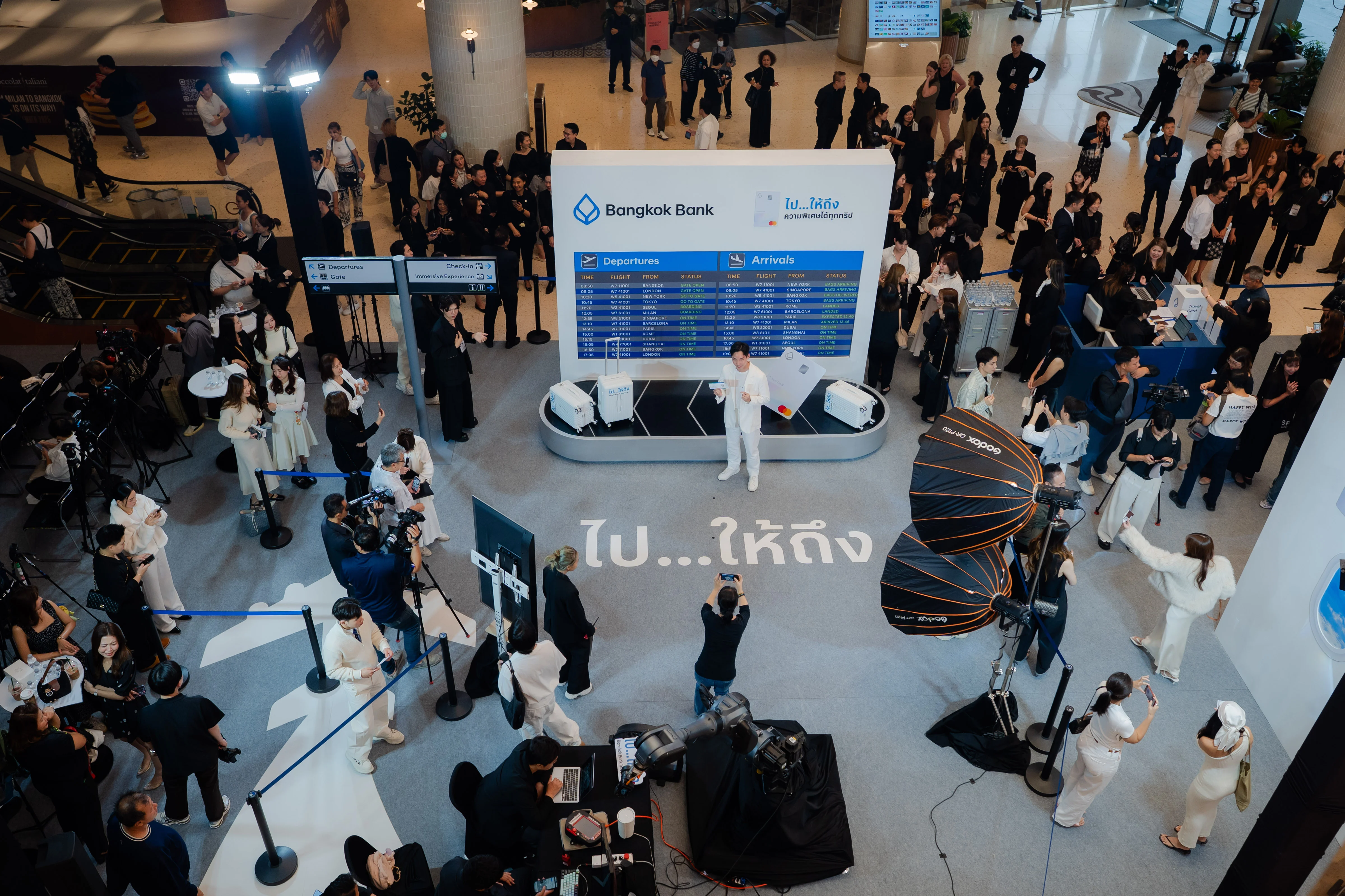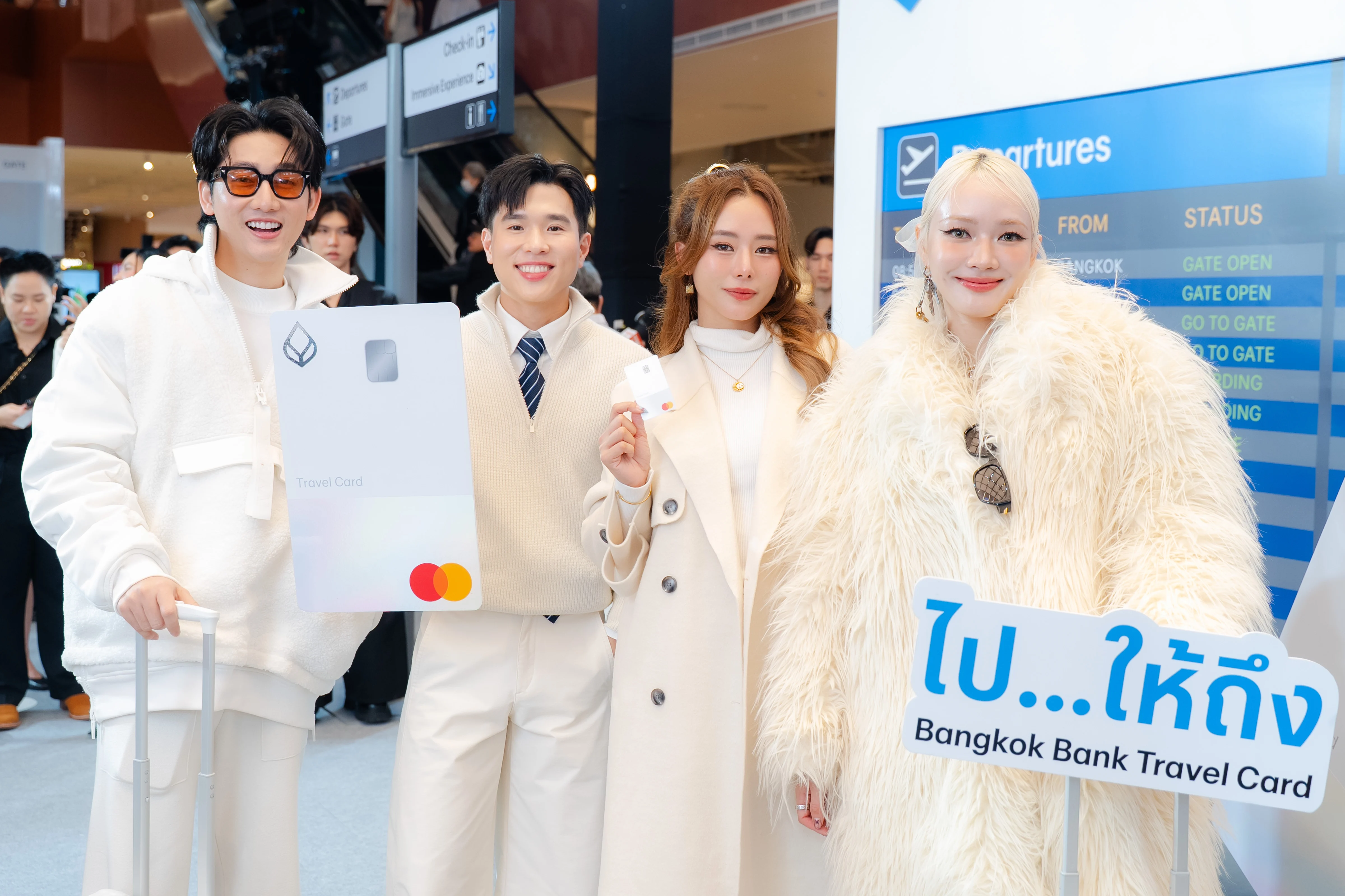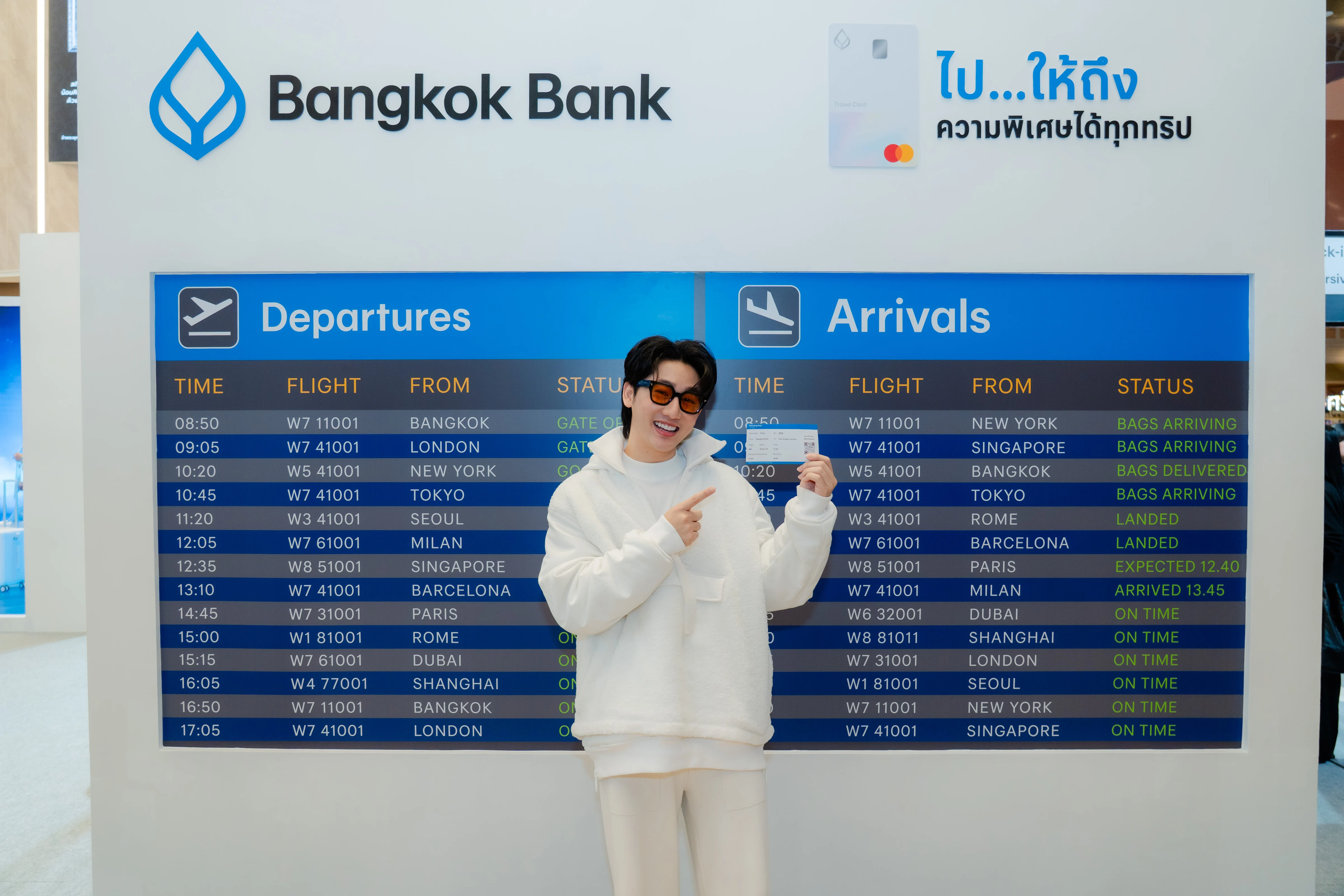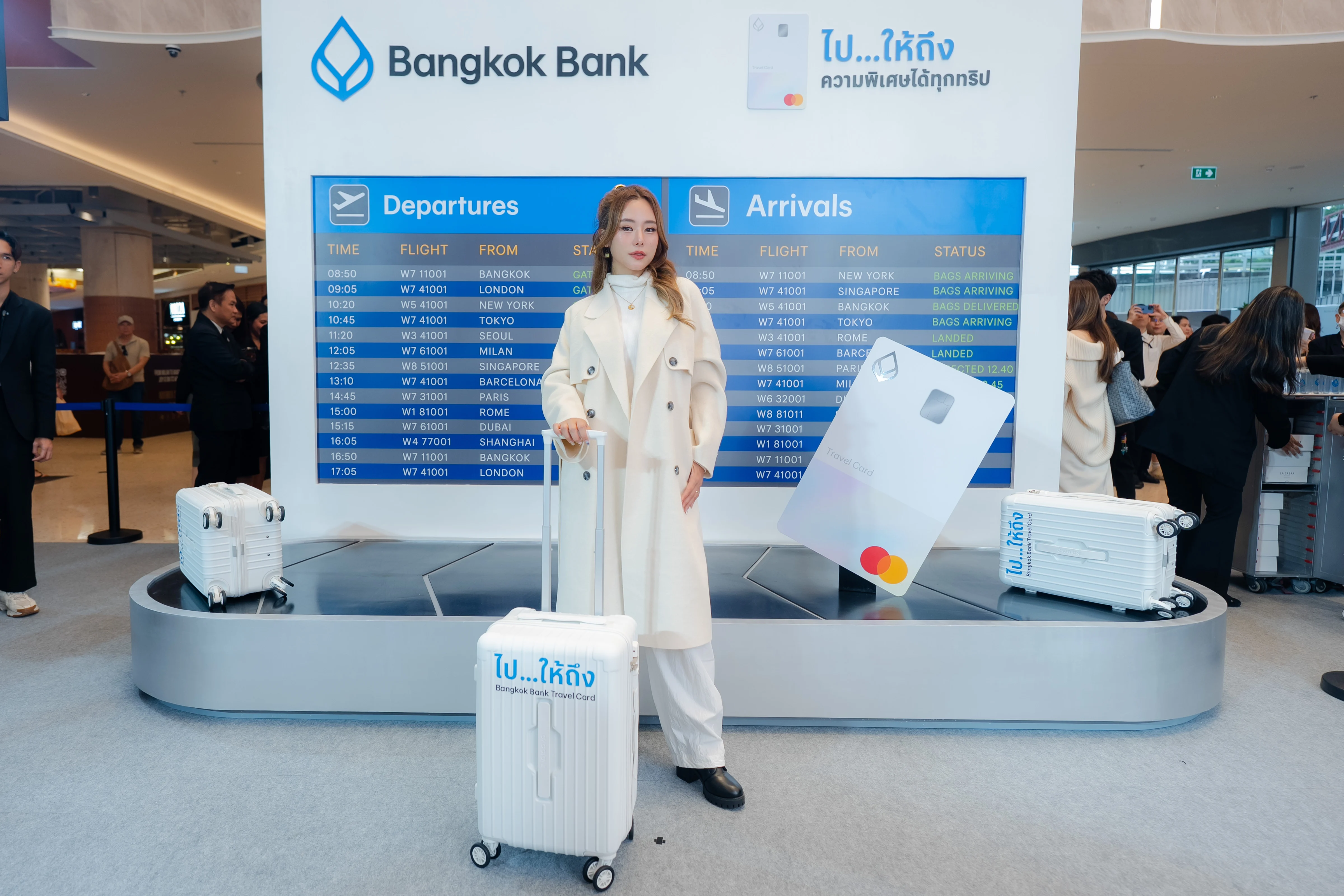 นอกจากสิทธิพิเศษจะจัดเต็มตอบโจทย์นักเดินทางแล้ว งานเปิดตัว Bangkok Bank Travel Card ยังจัดเต็มด้วยการเนรมิตพื้นที่ในดุสิต เซ็นทรัล พาร์ค ให้กลายเป็นสนามบินใจกลางกรุงเทพฯ มีมุมถ่ายภาพ รวมถึงเหล่า KOL สายไลฟ์สไตล์และท่องเที่ยวชั้นนำของไทย อย่าง โจวปลื้ม ณัฐรดา, ใบเฟิร์น อัญชสา และ นัท อภิวิชญ์ มาร่วมสร้างบรรยากาศและแรงบันดาลใจที่ทำให้อยากจะเก็บกระเป๋าออกเดินทางทันที แถมยังเปิดตัวสุดยิ่งใหญ่ ด้วยการบินโดรนส่ง Bangkok Bank Travel Card ถึงบนเวทีอีกด้วย