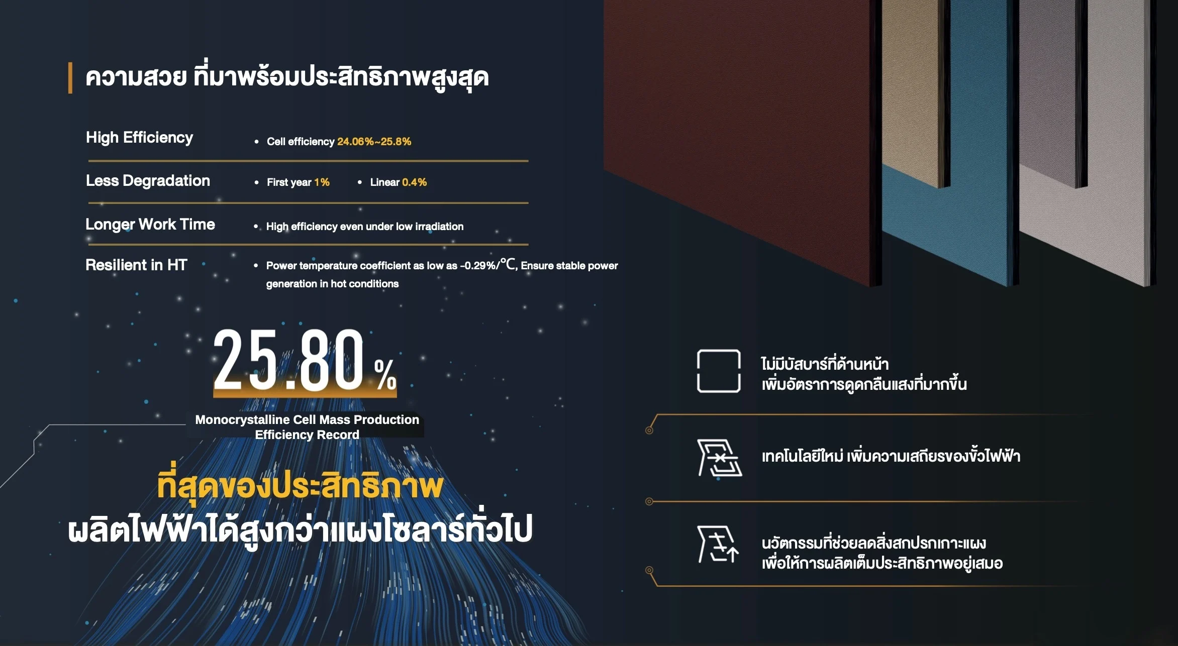 “BIPV” (Building-integrated photovoltaics) หรือ เซลล์แสงอาทิตย์แบบผสานวัสดุอาคาร เป็นนวัตกรรมโซลาร์ระดับโลกที่น่าจับตา ด้วยคอนเซปต์ ดีไซน์ ที่โดดเด่นทั้งเรื่องความสวยงาม การ Custom สี รูปทรง และขนาดได้อย่างอิสระ นับเป็นส่วนหนึ่งที่เพิ่มเสน่ห์ให้การออกแบบงานสถาปัตยกรรมนั้นมีเอกลักษณ์เฉพาะตัวไม่เหมือนใคร มาพร้อมเทคโนโลยี BC (Back Contact) เซลล์ประสิทธิภาพสูงถึง 25.8% แข็งแรง ทนทาน และปลอดภัย โดยผ่านการทดสอบมาแล้วอย่างเข้มข้นทุกสภาพแวดล้อม พร้อมใส่ใจด้านสิ่งแวดล้อมอย่างยั่งยืน