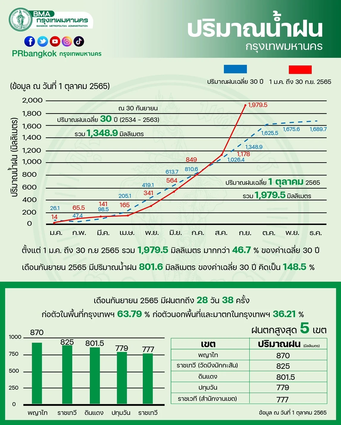 นายเอกวรัญญู อัมระปาล โฆษกของกรุงเทพมหานคร แจ้งว่า ศูนย์ควบคุมระบบป้องกันน้ำท่วมกรุงเทพมหานครรายงานสรุปผลปริมาณน้ำฝน 1 ม.ค. – 30 ก.ย 2565 มีปริมาณน้ำฝนสะสมสูงถึง 1979.5 มิลลิเมตร เปรียบเทียบกับปี 2564 ในช่วงเดียวกันมีปริมาณ 1556 มิลลิเมตร และมากกว่าค่าเฉลี่ย 30 ปีถึง 46.7% โดยปริมาณฝนเฉลี่ยคาบ 30 ปี (2534 – 2563) อยู่ที่ 1348.9 มิลลิเมตร