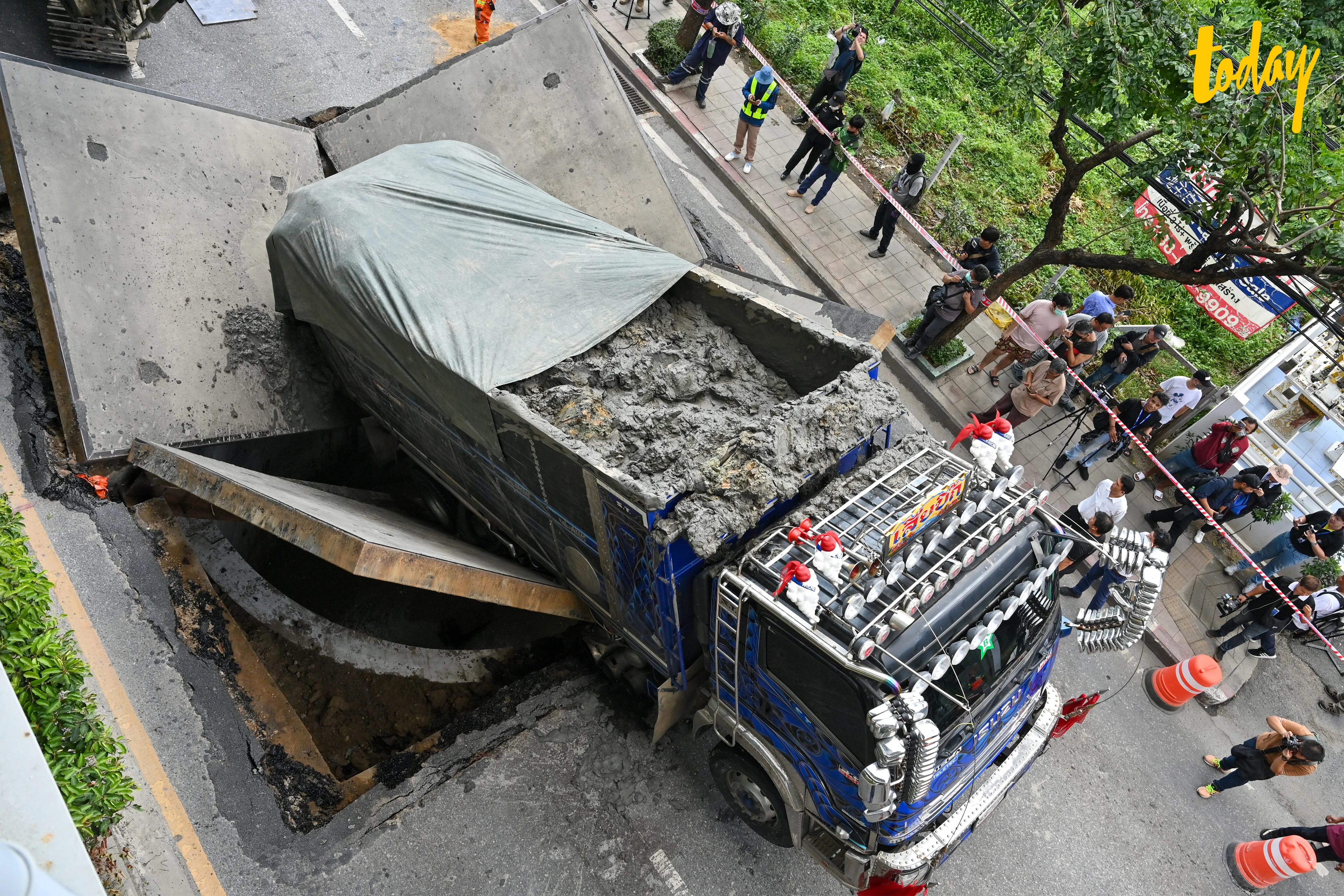 ยกรถบรรทุก ตกบ่อ ถนนสุขุมวิท 64/1 ได้แล้ว แต่ยังติดปิดจราจร ขาเข้า ซ่อม