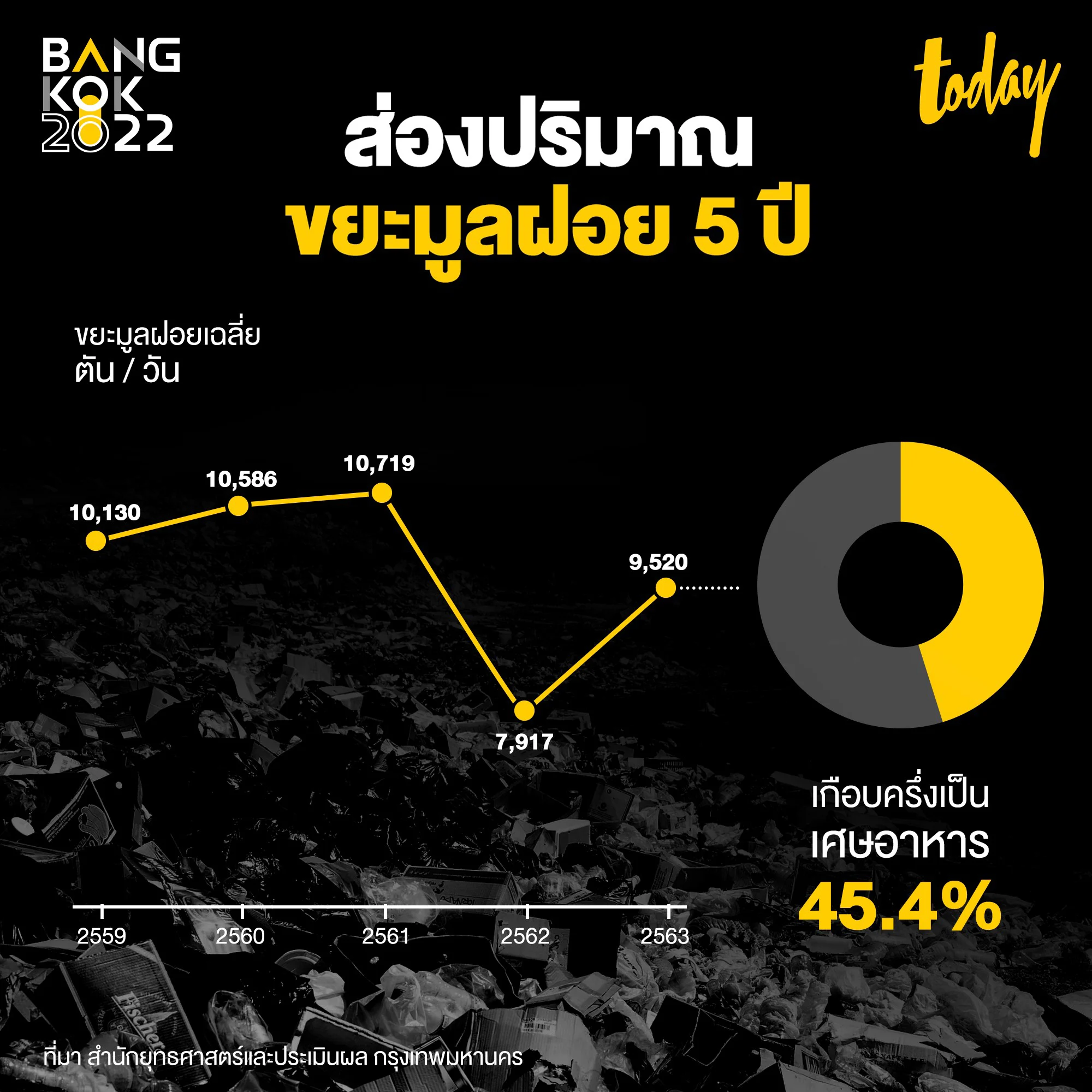 ข้อมูลจากสำนักยุทธศาสตร์และประเมินผล กรุงเทพมหานคร ระหว่างปี 2559 – 2563 (ล่าสุด) ชี้ให้เห็นว่าขยะมูลฝอยที่ กทม. จัดเก็บมีปริมาณเฉลี่ย 3.5 ล้านตันต่อปี หรือเฉลี่ย 9,774 ตันต่อวัน