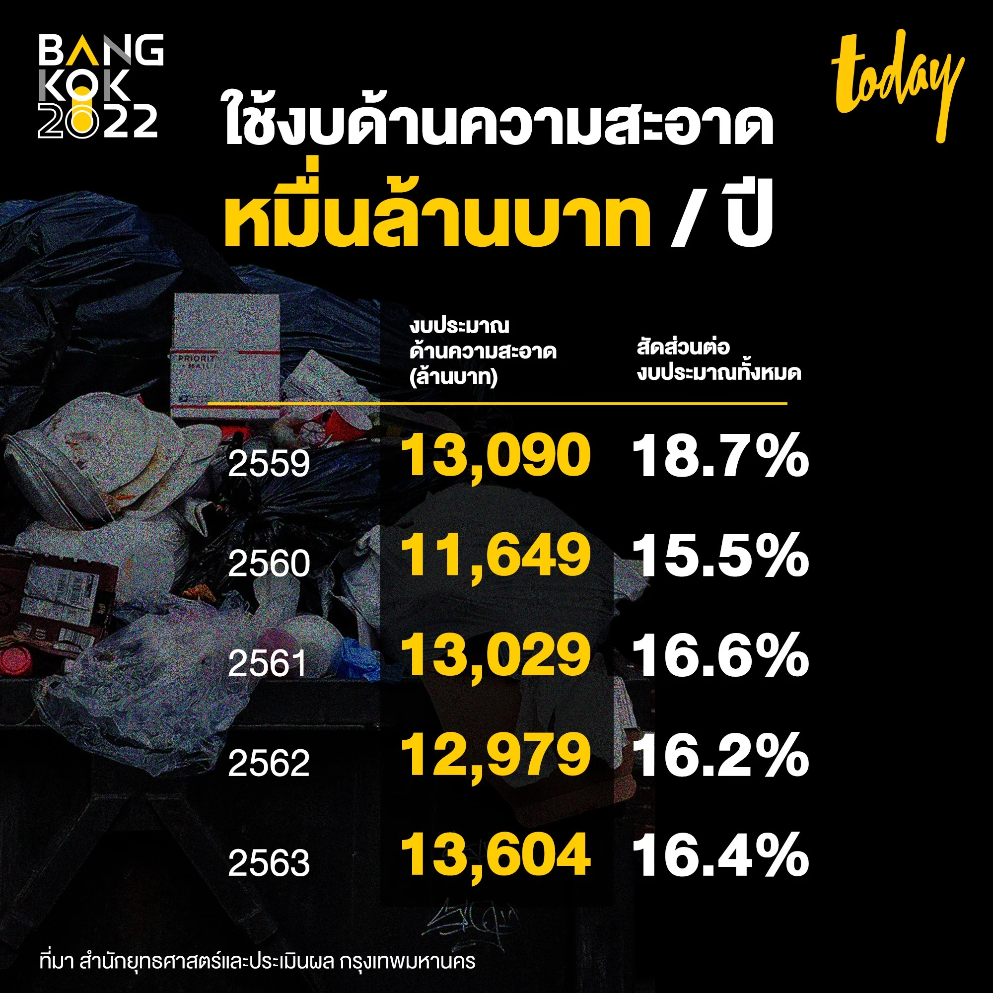 แต่หากย้อนไปไกลกว่านั้น ข้อมูลเมื่อปี 2550 พบว่า กทม. ใช้งบประมาณเพื่อรักษาความสะอาดและความเป็นระเบียบเรียบร้อยเพียง 6,946 ล้านบาท หรือหมายความว่าปัจจุบัน กทม. ใช้งบประมาณในส่วนนี้เพิ่มขึ้นกว่า 95% จากเมื่อ 13 ปีก่อน