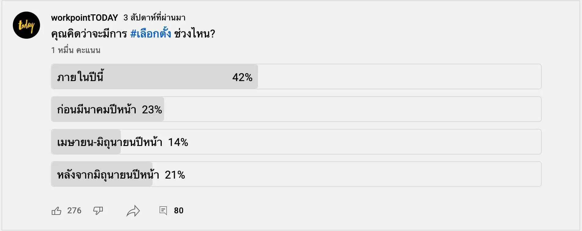 3 สัปดาห์ก่อน workpointTODAY ได้สำรวจความคิดเห็นผ่านชุมชนยูทูบ จากผู้ที่เข้ามาร่วมแสดงความคิดเห็น พบสูงสุดคิดว่า จะมีการเลือกตั้งภายในปี 2564
