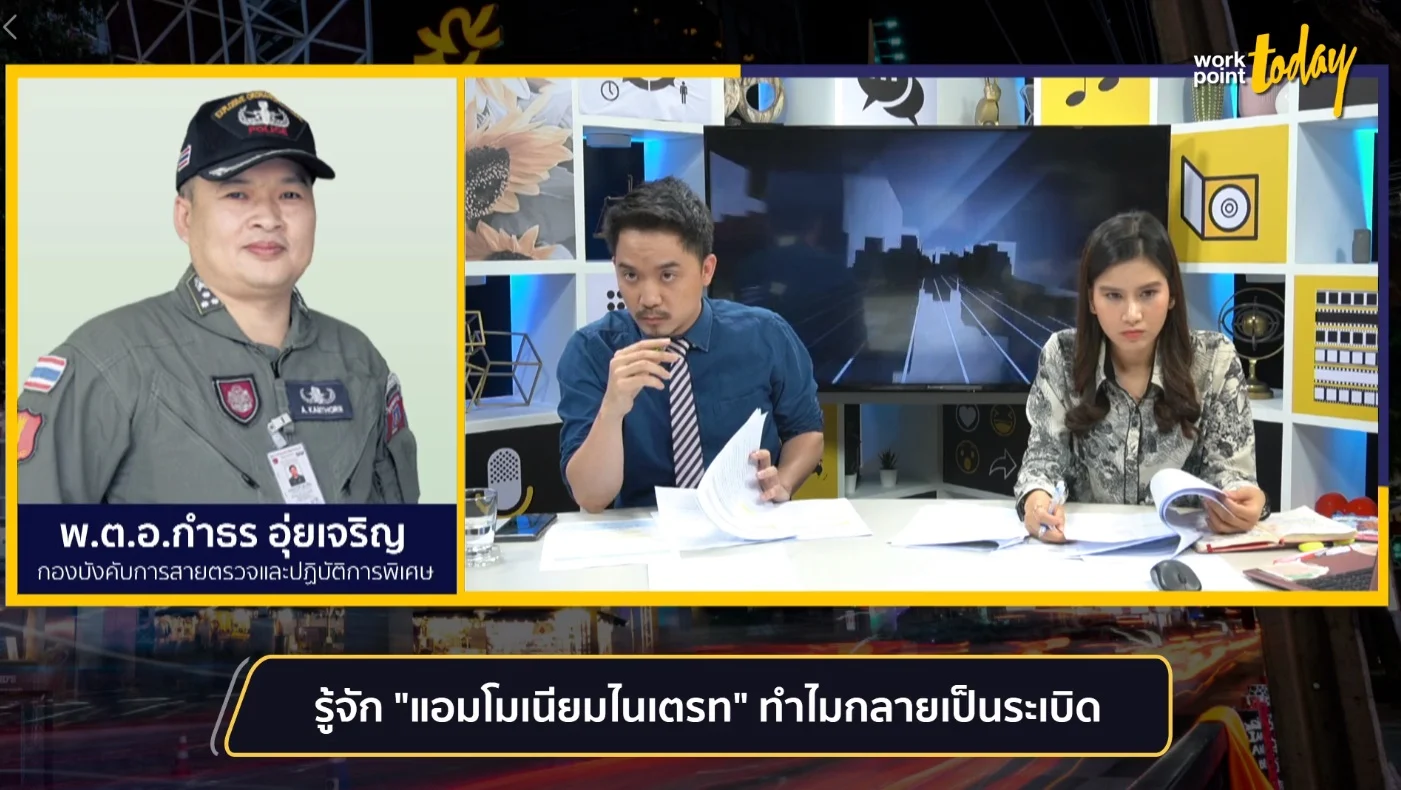วันที่ 5 ส.ค. 2563 พ.ต.อ.กำธร อุ่ยเจริญ รองผู้บังคับการกองบังคับการสายตรวจและปฏิบัติการพิเศษ ผู้เชี่ยวชาญด้านวัตถุระเบิด ให้สัมภาษณ์รายการ workpointTODAY ถึงกรณีสารแอมโมเนียมไนเตรตในประเทศไทยว่ามีกฎหมายควบคุม คือ พ.ร.บ.ควบคุมยุทธภัณฑ์เพราะสารตัวนี้จัดเป็นวัตถุระเบิด ใครจะใช้ต้องได้รับอนุญาตจากปลัดกระทรวงกลาโหม
