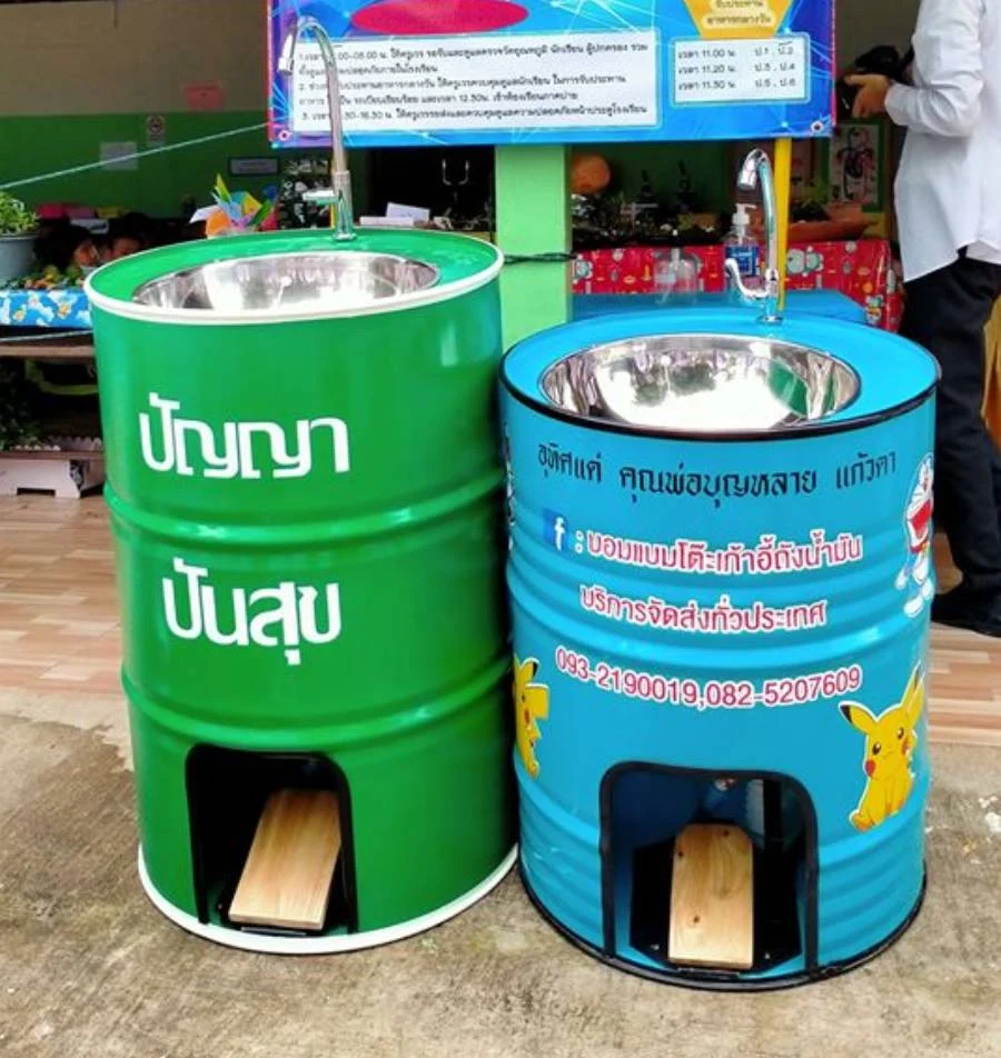 ภูมิพัฒน์ เล่าอีกว่า ช่วงล็อกดาวน์โควิดไม่มีออเดอร์ เขานอนว่างๆ อยู่เกือบเดือน ระหว่างนั้นมีโอกาสได้ดูรายการช่องหนึ่งของต่างประเทศ เห็นวิธีทำอ่างล้างมือแบบใช้เท้าเหยียบ เขาจึงได้ไอเดียคิดนอกกรอบ สร้างอาชีพจากโควิด นำอุปกรณ์และเศษถังน้ำมันที่ตัดเหลือมาประดิษฐ์เป็นอ่างล้างมือแบบเหยียบได้ โดยใช้กะละมังสแตนเลสเป็นอ่าง พ่นสีใส่ลวดลายตามลูกค้าสั่งสร้างรายได้ดีจนเกินคาด เพราะมีออเดอร์จากโรงเรียนต่างๆ สั่งอ่างล้างมือไซส์เด็ก ที่ให้เด็กอนุบาลล้างมือได้ เขาจึงใส่ลวดลายตามที่เด็กชอบไปด้วย