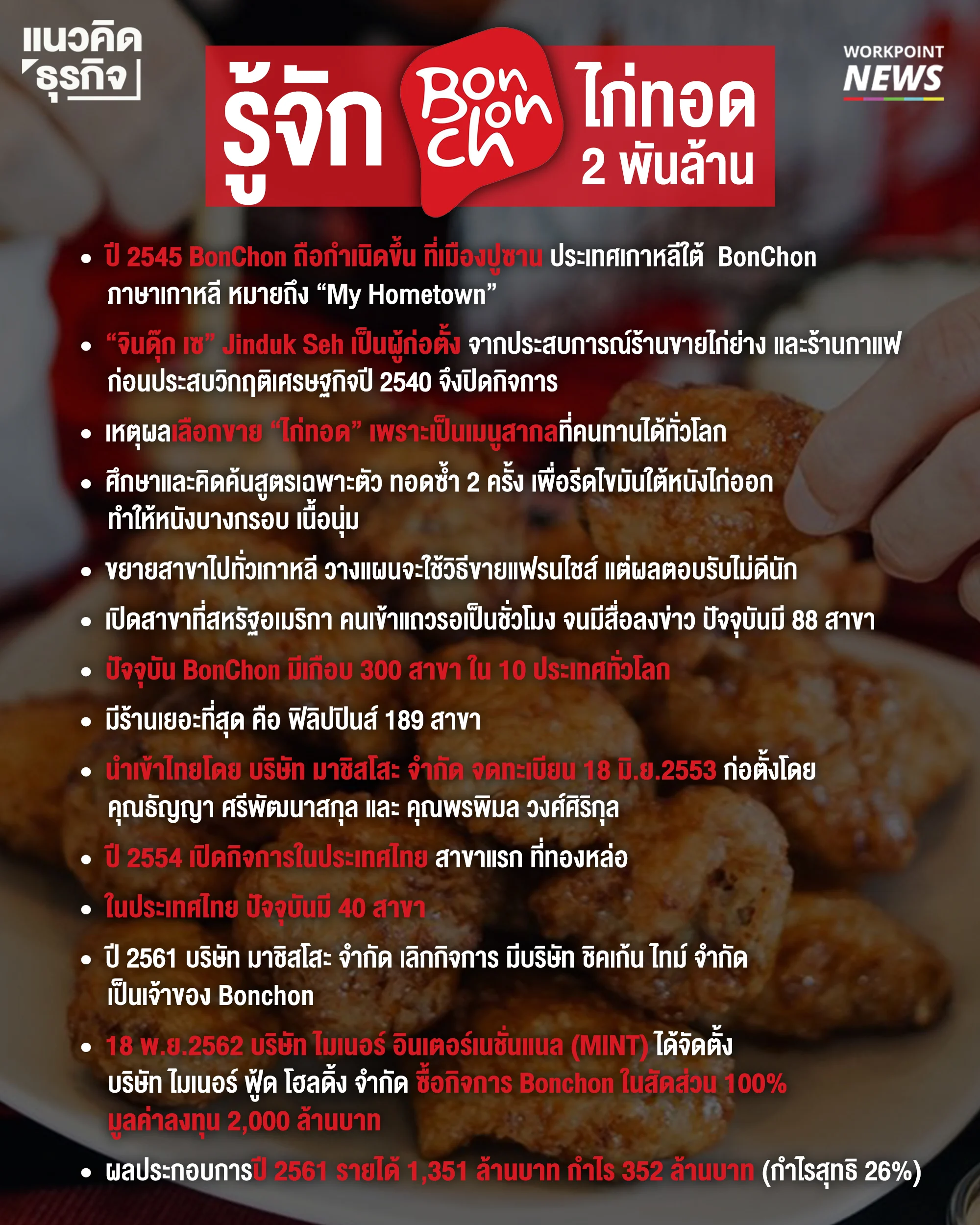 ผลประกอบการของ Bonchon ในประเทศไทยปี 2561 รายได้ 1,351 ล้านบาท กำไร 352 ล้านบาท (กำไรสุทธิ 26%)