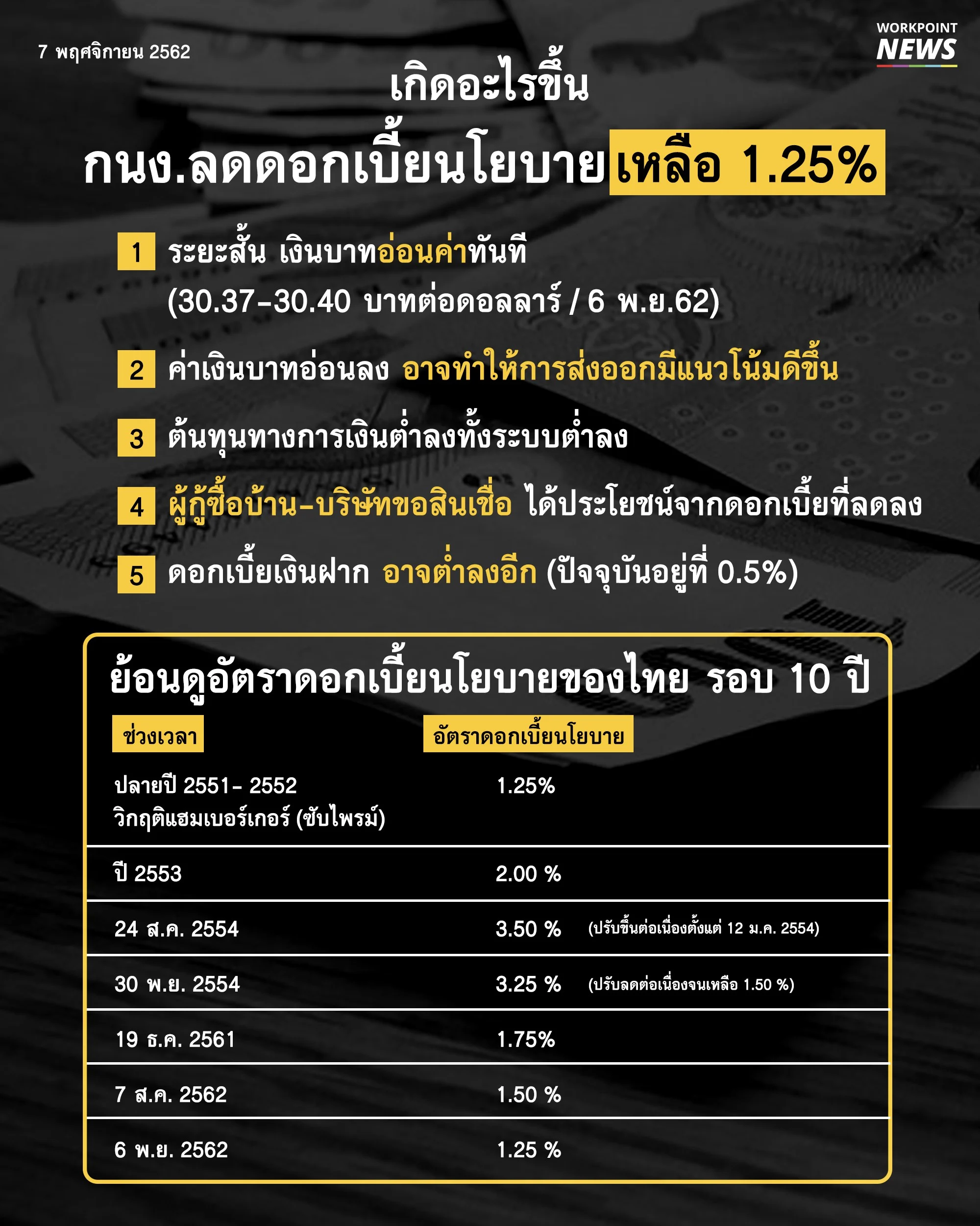 สิ่งที่เกิดขึ้น ภายหลังคณะกรรมการนโยบายการเงิน (กนง.) มีมติ 5 ต่อ 2 เสียงลดอัตราดอกเบี้ยนโยบาย จากร้อยละ 1.50 เป็นร้อยละ 1.25 ต่อปี ซึ่งเป็นอัตราที่ต่ำที่สุดในรอบ 10 ปี นับตั้งแต่ปี 2552 เนื่องจาก กนง.ประเมินว่าเศรษฐกิจไทยมีแนวโน้มขยายตัวต่ำกว่าที่ประเมินไว้ และต่ำกว่าศักยภาพมากขึ้นจากการส่งออกที่ลดลง อาทิ