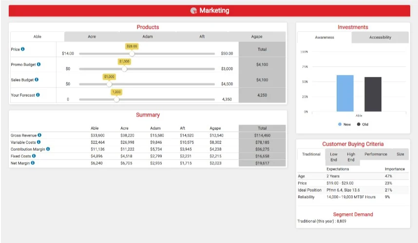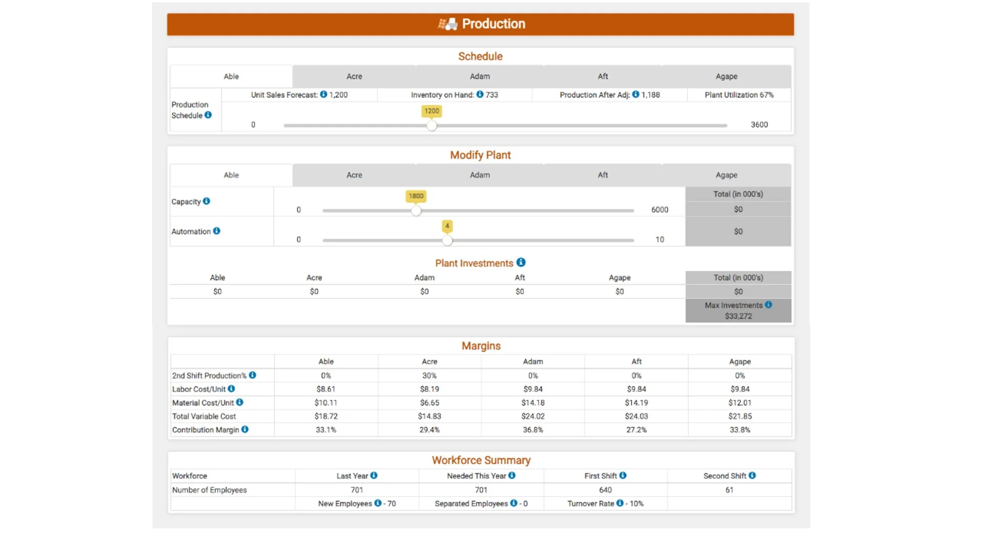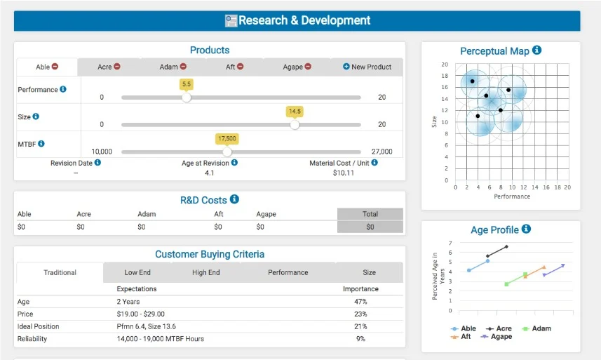 ผู้เข้าร่วมเกมจะต้องวางกลยุทธ์ โดยตัดสินใจทางเลือกทั้งหมด 4 แผนกหลักๆ ดังนี้