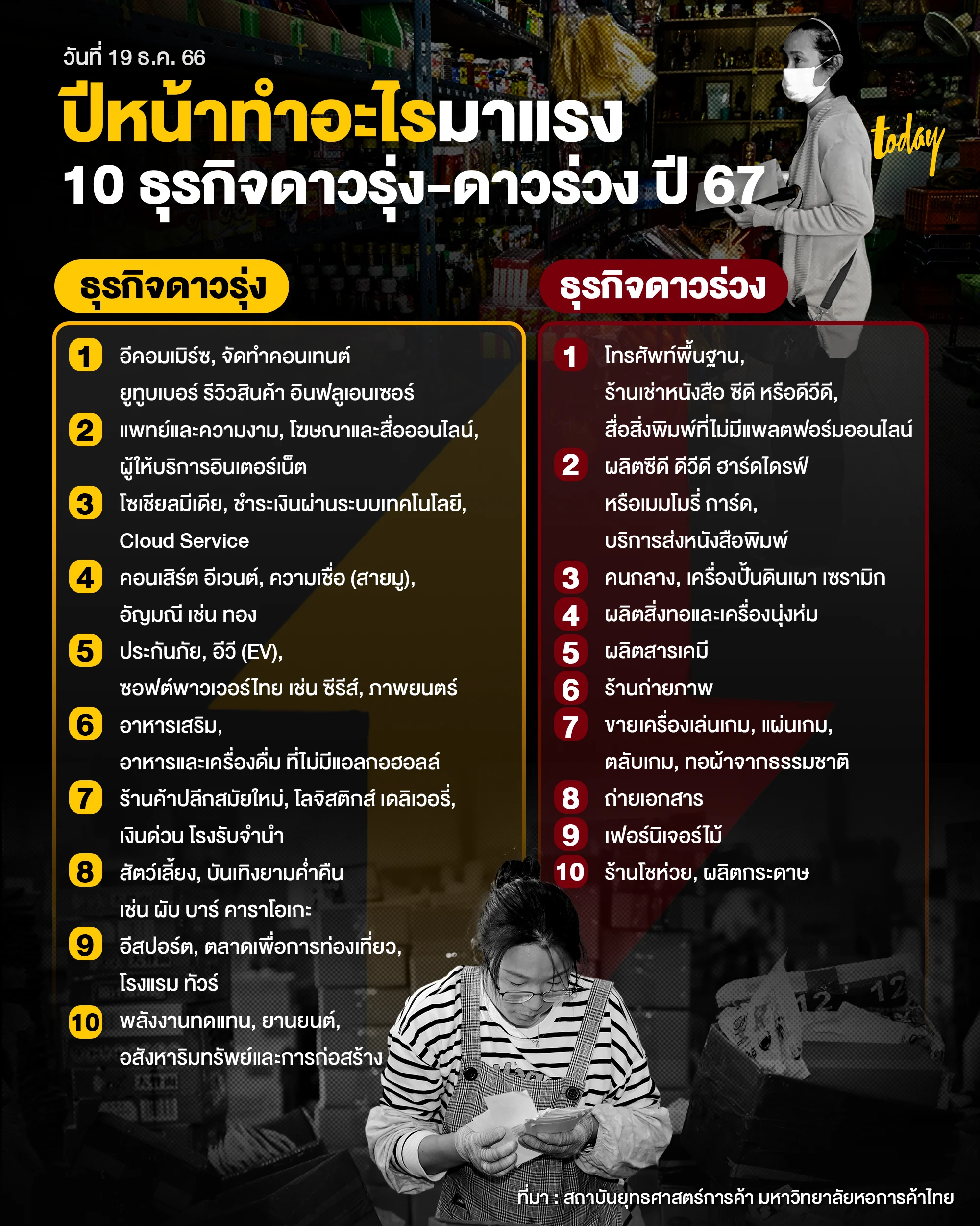 สำหรับในปี 2567 สถาบันยุทธศาสตร์การค้า มหาวิทยาลัยหอการค้า ได้คาดการณ์ ธุรกิจดาวรุ่ง และ ธุรกิจดาวร่วง ในปีหน้าเอาไว้ โดยอ้างอิง สำรวจ และให้คะแนน ทางด้านยอดขาย ต้นทุน ส่วนต่างของยอดขายต่อต้นทุน ผลกระทบจากปัจจุบันเสี่ยงและภาวะการแข่งขัน ความต้องการความสอดคล้องกับกระแสนิยม