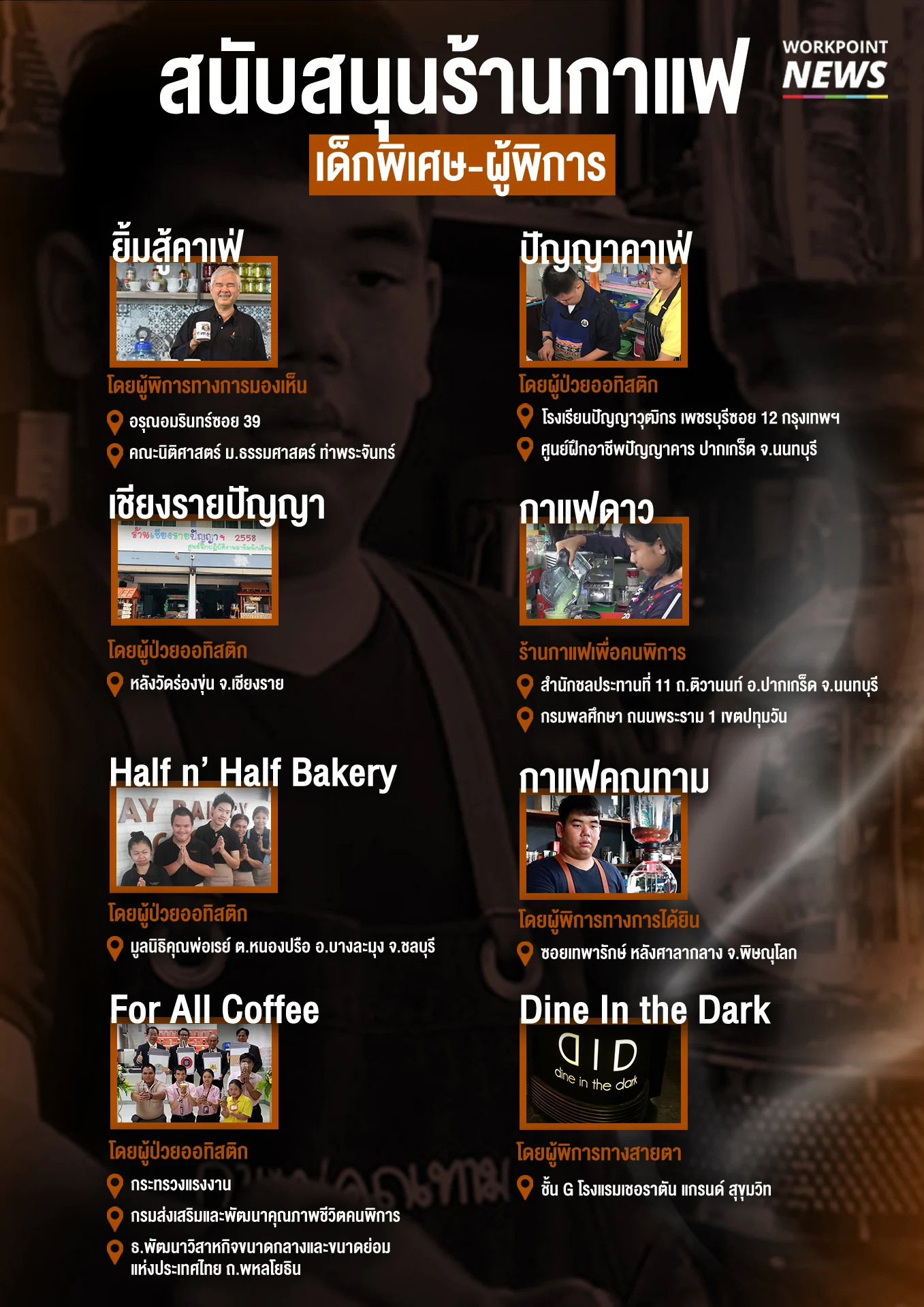 คอกาแฟสายบุญต้องไม่พลาดร้านที่ให้บริการโดยผู้พิการ วันนี้เวิร์คพอยท์ รวบรวมมาให้กันถึง 7 ร้าน พร้อมพิกัดการเดินทาง