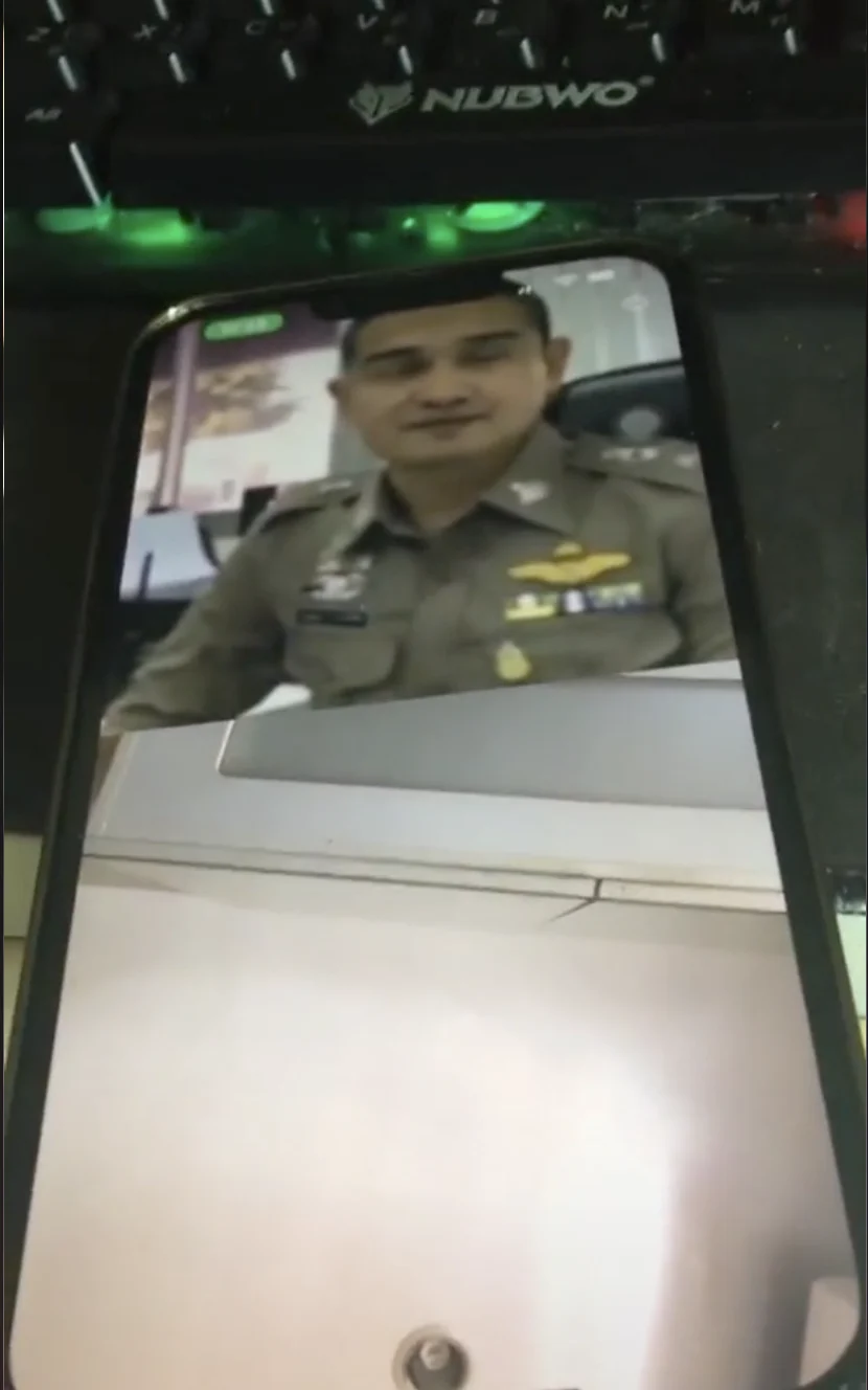 โดยในคลิปที่นำมาโพสต์ มิจฉาชีพใช้รูปภาพตำรวจ นั่งที่เก้าอี้แต่ตัวไม่ขยับ มีขยับแค่ปากเท่านั้น และพูดท้าให้มีการเปิดกล้องคุยกับตำรวจ