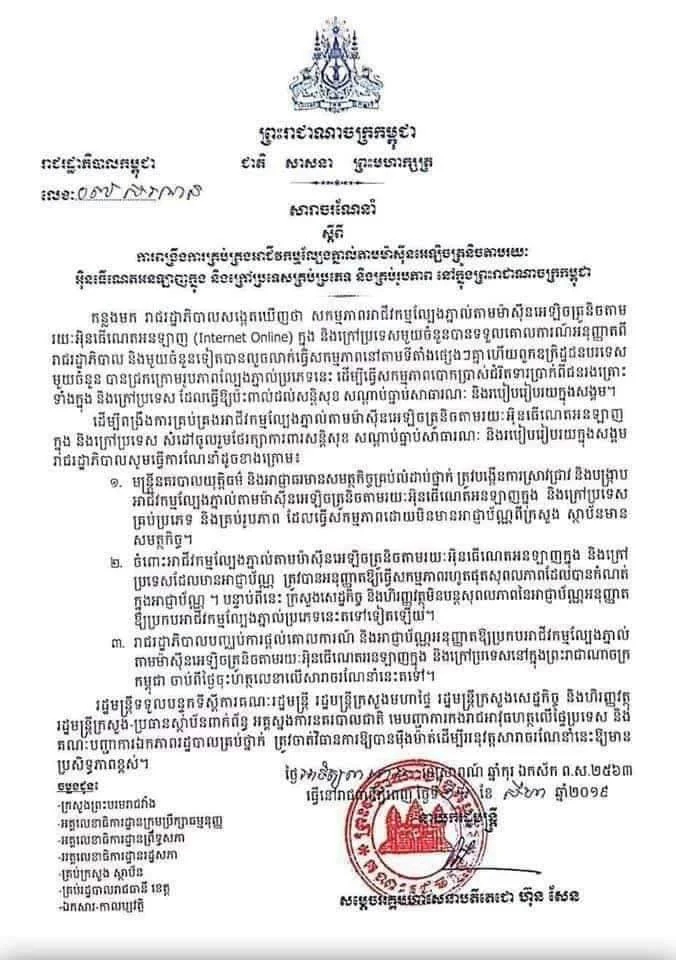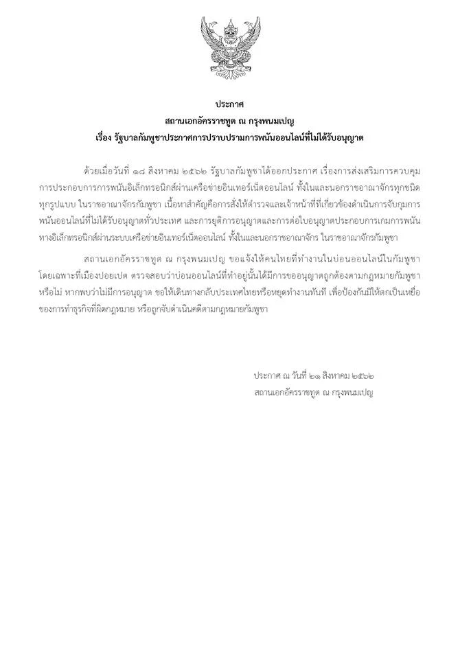 สถานเอกอัครราชทูต ณ กรุงพนมเปญ ออกประกาศสถานเอกอัครราชทูต ณ กรุงพนมเปณ เรื่อง รัฐบาลกัมพูชาประกาศการปราบปรามการพนันออนไลน์ที่ไม่ได้รับอนุญาต ด้วยเมื่อวันที่ 18 สิงหาคม 2562 ได้ออกประกาศ เรื่องการส่งเสริมการควบคุมการประกอบการการพนันอิเล็กทรอนิกส์ ผ่านเครือข่ายอินเทอร์เน็ตออนไลน์ ทั้งในและนอกราชอาณาจักรทุกชนิด ทุกรูปแบบ ในราชอาณาจักรกัมพูชา