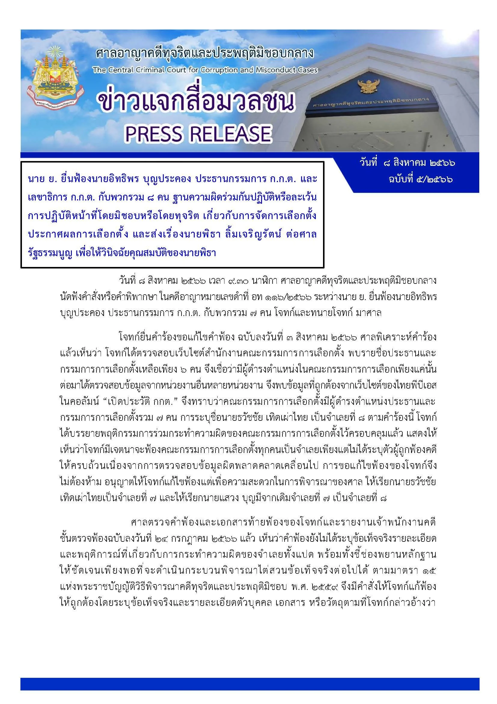ในความผิดฐานเป็นเจ้าพนักงาน ของรัฐ กระทำการในฐานะเจ้าพนักงานของรัฐ โดยทุจริต เจตนา ร่วมกันออกประกาศคณะกรรมการการเลือกตั้ง สมาชิกสภาผู้แทนราษฎร พ.ศ.2566