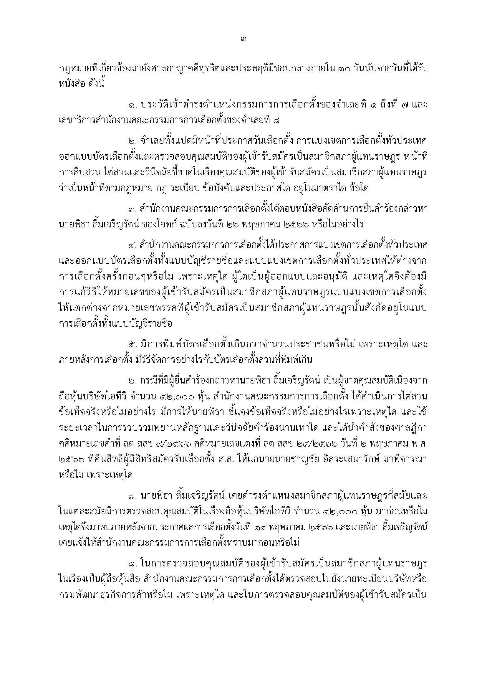 3. สํานักงานคณะกรรมการการเลือกตั้งได้ตอบหนังสือคัดค้านการยื่นคําร้องกล่าวหา นายพิธา ลิ้มเจริญรัตน์ ของโจทก์ ฉบับลงวันที่ 26 พ.ค. 66 หรือไม่อย่างไร