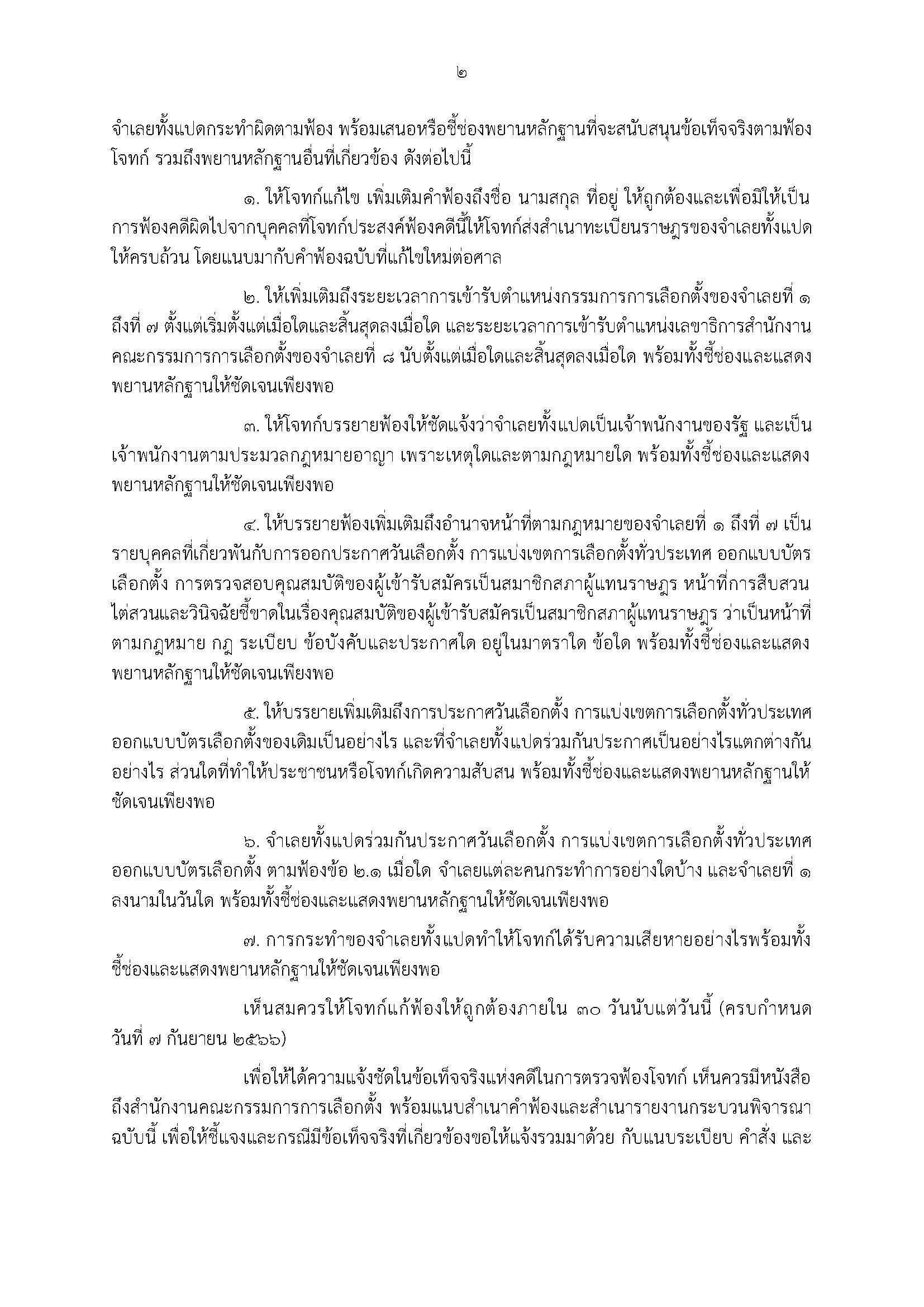 เพื่อให้ได้ความแจ้งชัดในข้อเท็จจริงแห่งคดีในการตรวจฟ้องโจทก์ เห็นควรมีหนังสือถึงสํานักงานคณะกรรมการการเลือกตั้ง พร้อมแนบสำเนาคำฟ้องและสำเนารายงานกระบวนพิจารณา ฉบับนี้ เพื่อให้ชี้แจงและกรณีมีข้อเท็จจริงที่เกี่ยวข้องขอให้แจ้งรวมมาด้วย กับแนบระเบียบ คำสั่ง และกฎหมายที่เกี่ยวข้องมายังศาลอาญาคดีทุจริตและประพฤติมิชอบกลางภายใน 30 วันนับจากวันที่ได้รับหนังสือ ดังนี้