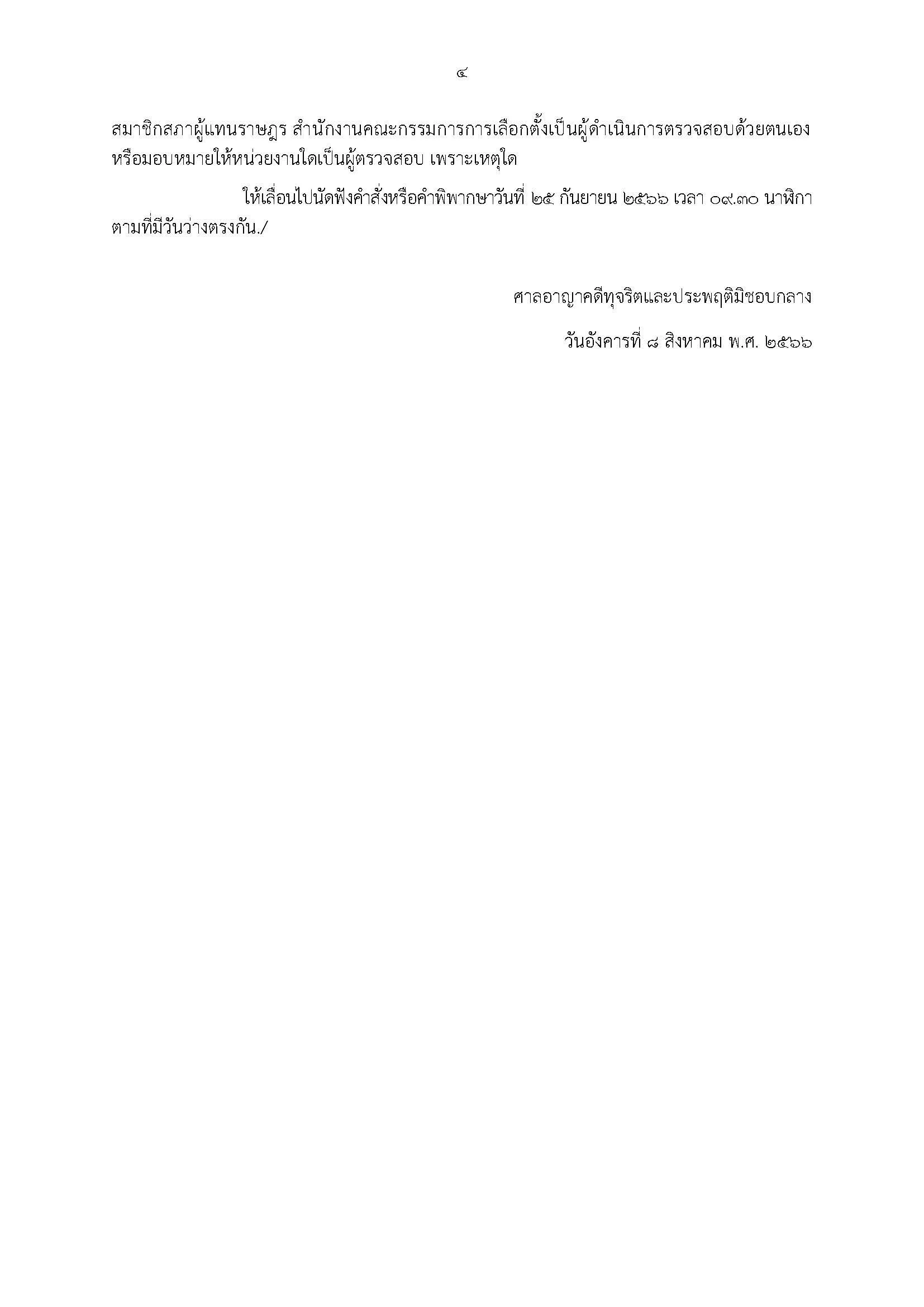ให้เลื่อนไปนัดฟังคำสั่งหรือคําพิพากษาวันที่ 25 ก.ย. 66 เวลา 09.30 น.