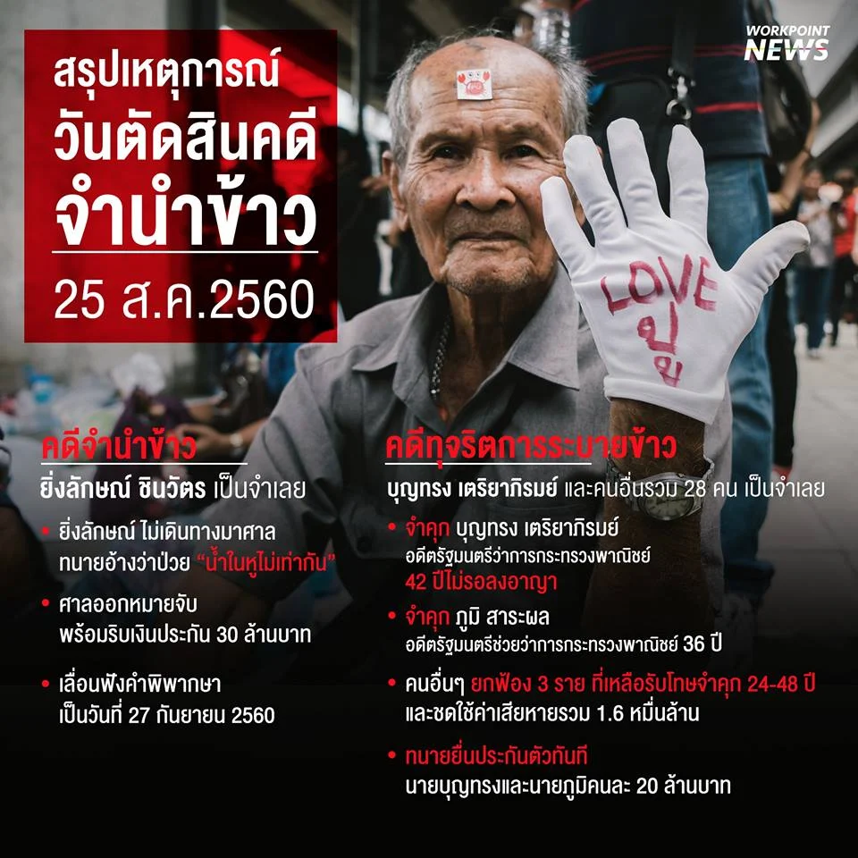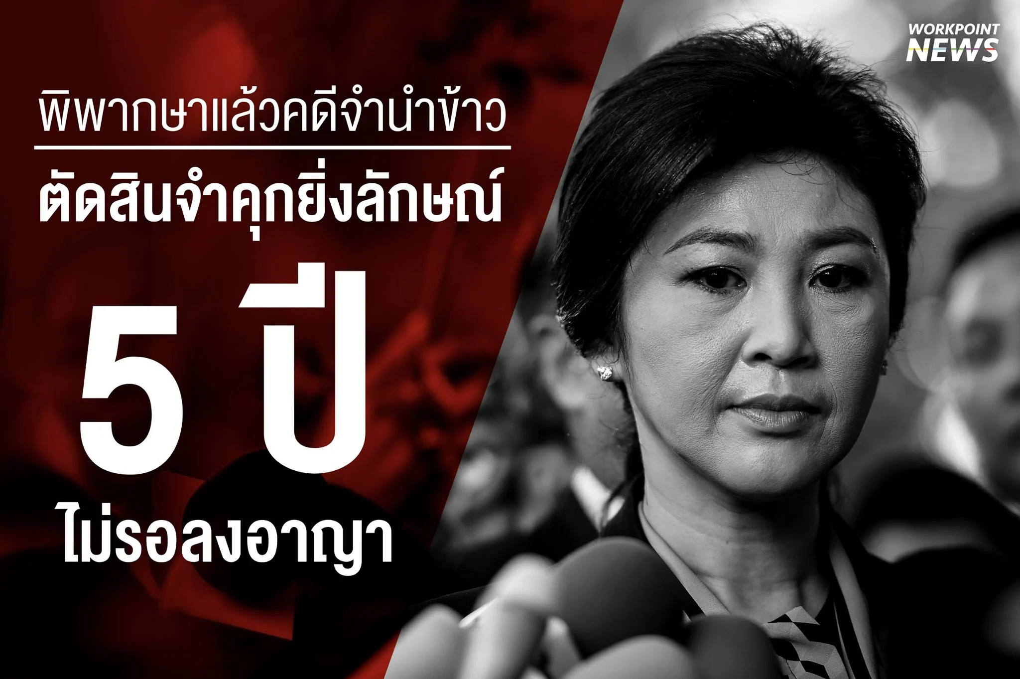 คดีทุจริตโครงการระบายข้าวจีทูจี นำมาสู่คำพิพากษา จำคุก น.ส.ยิ่งลักษณ์ ชินวัตร อดีตนายกรัฐมนตรี เป็นเวลา 5 ปี โดยไม่รอลงอาญา เพราะ ไม่ระงับยับยั้งจนเกิดความเสียหาย เป็นการละเว้นการปฏิบัติหน้าที่โดยทุจริต เป็นความผิดตามประมวลกฎหมายอาญา มาตรา 157 (เดิม) และพระราชบัญญัติประกอบรัฐธรรมนูญว่าด้วยการป้องกันและปราบปรามทุจริต พ.ศ. 2542 มาตรา 123/1