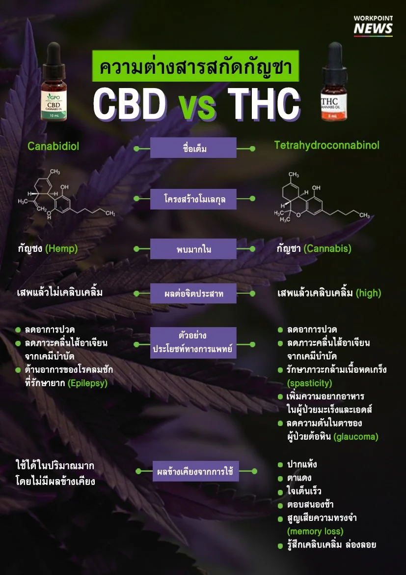เพื่อให้เข้าใจได้มากขึ้นว่า สารสกัดจากกัญชา ทั้งสาร THC และ CBD คืออะไร ข่าวเวิร์คพอยท์ขอแยกคุณลักษณะสำคัญและความต่างของสารทั้งสองตัวให้เห็นดังนี้