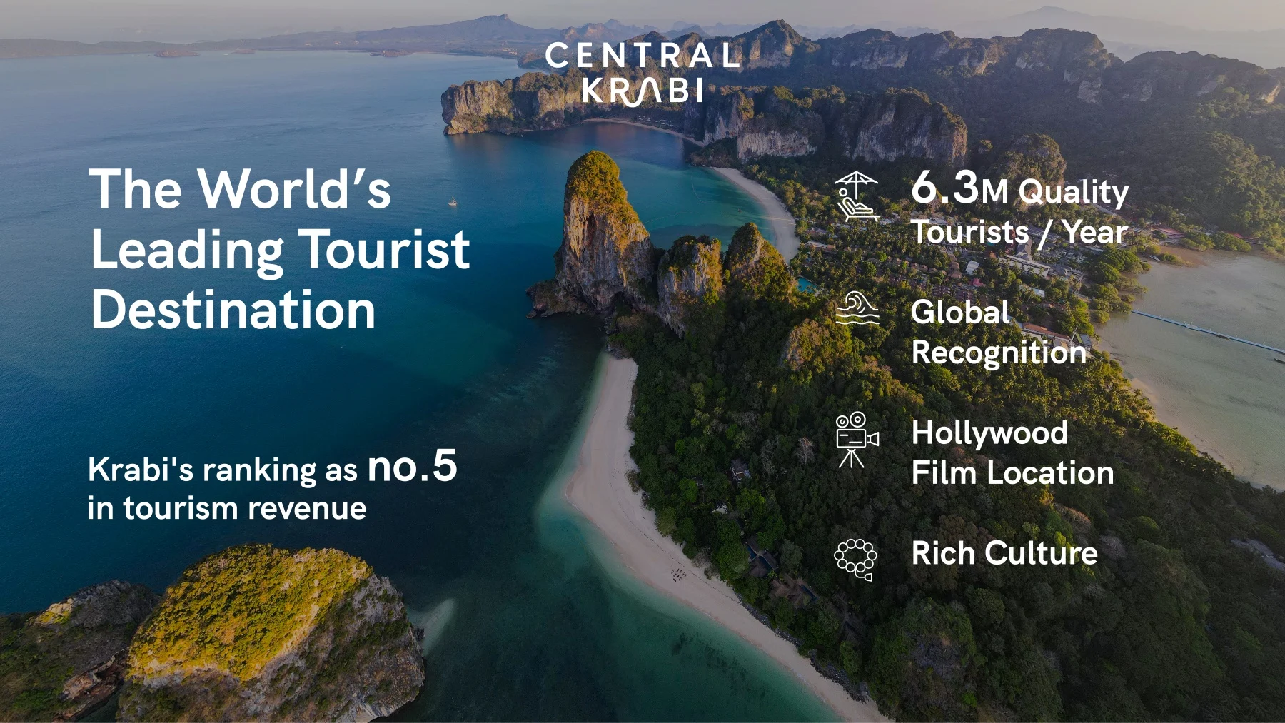 ศูนย์กลางการท่องเที่ยวยั่งยืน (Sustainable Tourism) ที่สามารถทำได้จริงและเที่ยวได้จริง ผนวกกับศักยภาพของจังหวัดกระบี่ ที่โดดเด่นด้วยธรรมชาติอันงดงาม วัฒนธรรม และวิถีชีวิตผู้คนที่หลากหลายเชื้อชาติ ศาสนา ตลอดจนอาหารและศิลปะอันเป็นเอกลักษณ์ ทำให้กระบี่เป็นจุดหมายปลายทางที่แตกต่างและน่าจดจำ พร้อมต้อนรับนักท่องเที่ยวคุณภาพจากทั่วโลก เราจึงพัฒนาโครงการ เซ็นทรัล กระบี่ ให้เดินไปในทิศทางเดียวกัน ภายใต้คอนเซ็ปต์ ‘Made by Krabi’ ที่เปิดพื้นที่ให้ชุมชนมีส่วนร่วมอย่างแท้จริง ถ่ายทอดอัตลักษณ์ท้องถิ่น และสะท้อนความต้องการของคนกระบี่ เพื่อสร้างความภาคภูมิใจร่วมกันและยกระดับเมืองสู่เวทีโลกอย่างยั่งยืน”
