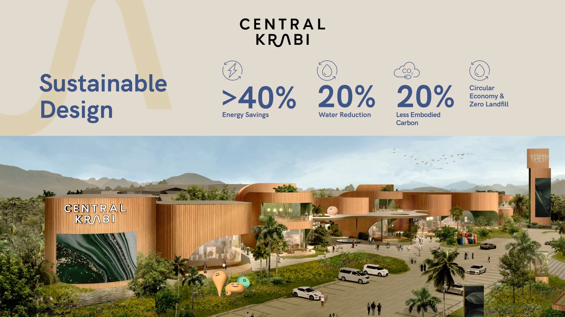 ดร.ณัฐกิตติ์ ตั้งพูลสินธนา กรรมการผู้จัดการใหญ่ สายงานการตลาด บมจ. เซ็นทรัลพัฒนา กล่าวว่า “เซ็นทรัลกระบี่ จะเป็น ศูนย์การค้าแนวคิดความยั่งยืนแห่งแรกของไทย ที่มุ่งสู่การรับรองมาตรฐานสากล EDGE Certification – Zero Level โดยตั้งเป้าลด Carbon Footprint ตั้งแต่กระบวนการก่อสร้าง ซึ่งเป็นเทรนด์การพัฒนาศูนย์การค้าระดับโลกที่รองรับการใช้ชีวิตในอนาคต ทั้งนี้สอดคล้องกับวิสัยทัศน์ ‘Krabi Prototype’ ที่ทุกภาคส่วนร่วมกันผลักดันยกระดับจังหวัดกระบี่ให้เป็น