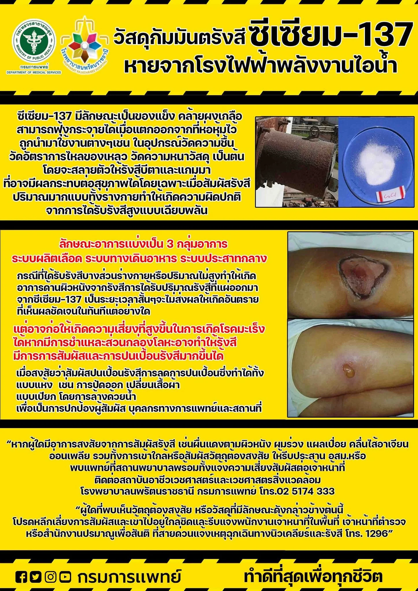 ขณะที่ นายแพทย์กิติพงษ์ พนมยงค์ นายแพทย์เชี่ยวชาญ ด้านเวชกรรม สาขาเวชกรรมทั่วไป หัวหน้ากลุ่มศูนย์การแพทย์เฉพาะทางด้านอาชีวเวชศาสตร์และเวชศาสตร์สิ่งแวดล้อม โรงพยาบาลนพรัตนราชธานี กรมการแพทย์ บอกว่า หากผู้ใดมีอาการสงสัยจากการสัมผัสรังสี เช่น ผื่นแดงตามผิวหนัง ผมร่วง แผลเปื่อย คลื่นไส้อาเจียน อ่อนเพลีย รวมทั้งการเข้าใกล้หรือสัมผัสวัตถุต้องสงสัย ให้รีบประสาน อสม.หรือ พบแพทย์ที่สถานพยาบาล พร้อมทั้งแจ้งความเสี่ยงสัมผัสต่อเจ้าหน้าที่ โทร.สสจ.ปราจีนบุรี 037211626 ต่อ 102 หรือ ติดต่อสถาบันอาชีวเวชศาสตร์และเวชศาสตร์ รพ.นพรัตนราชธานี กรมการแพทย์ โทร.025174333