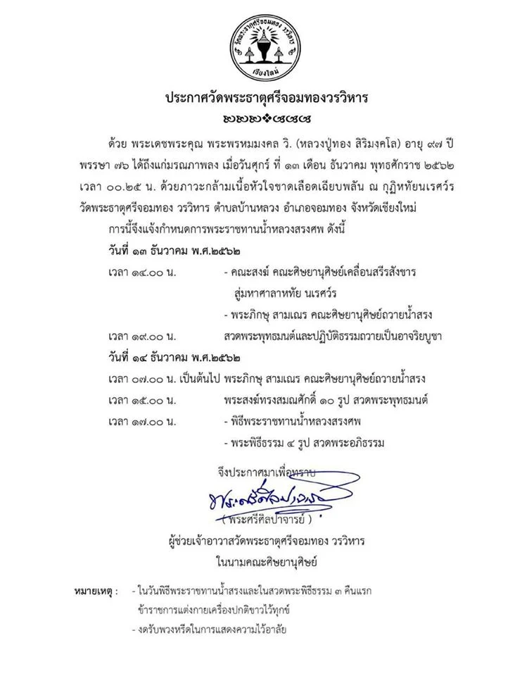 อย่างไรก็ตาม มีรายงานว่า จะมีการจัดพิธีถวายน้ำสรงสรีระสังขาร พระพรหมมงคล วิ. (หลวงปู่ทอง สิริมงฺคลมหาเถร) ในวันเสาร์ที่ 14 ธ.ค.2562 เวลา 16.00 น. ณ มหาศาลาหทัยนเรศวร์ วัดพระธาตุศรีจอมทองวรวิหาร