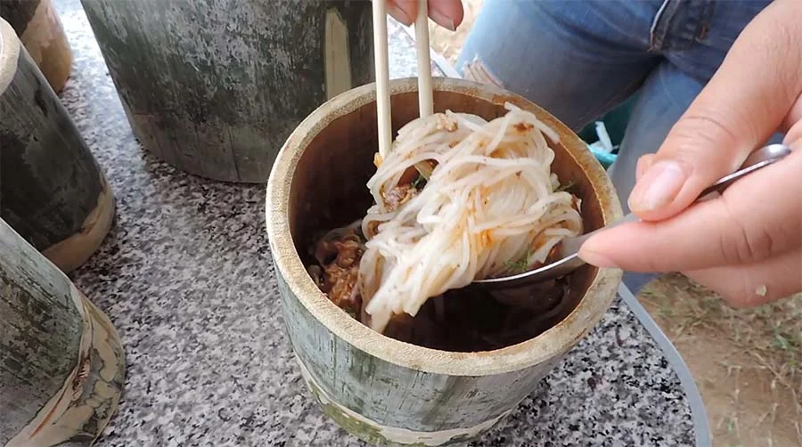 หลังจากได้ไม้ไผ่มาก็มาตัดเป็นท่อนความสูงประมาณ 6 นิ้ว และตกแต่งเอาเสี้ยนและเศษไม้ไผ่ออก จากนั้นมาทำความสะอาด แช่น้ำไว้ 1 คืน ป้องกันกระบอกไม้ไผ่แตก แล้วทำความสะอาดอีกรอบ ก่อนนำมาใส่น้ำเงี้ยว ซึ่งเป็นที่ชื่นชอบของลูกค้า เพราะน้ำเงี้ยวร้อนๆ ที่ใส่ในกระบอกไม้ไผ่เพิ่มความหอมขึ้นไปอีก ทำให้ยอดขายพุ่งถึงวันละ 4-5 พันบาท และหากวันหยุด ยอดขายพุ่งสูงถึงหลักหมื่น