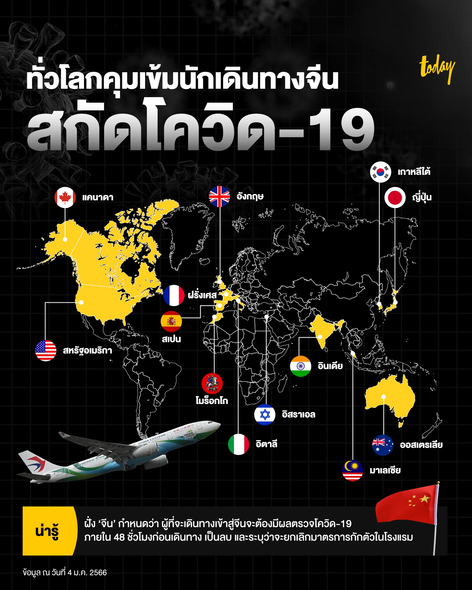 - โดยอังกฤษจะให้นักเดินทางที่มาจากจีน ตรวจโควิด-19 อีกครั้งเมื่อเดินทางถึงสนามบิน แต่ให้เป็นไปด้วยความสมัครใจ