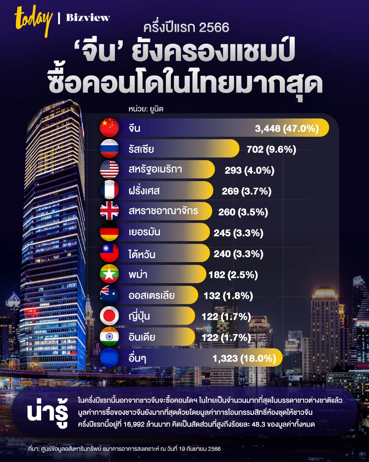 ในส่วนของมูลค่าการโอนกรรมสิทธิ์ห้องชุดทั่วประเทศให้คนต่างชาติทั่วประเทศในช่วง 6 เดือนแรกของปี 2566 (มกราคม – มิถุนายน) จะพบว่ามีการโอนกรรมสิทธิ์ห้องชุดให้ชาวจีน เป็นมูลค่าสูงสุด จำนวน 16,992 ล้านบาท คิดเป็นสัดส่วนที่สูงถึง 48.3% ของมูลค่าทั้งหมด