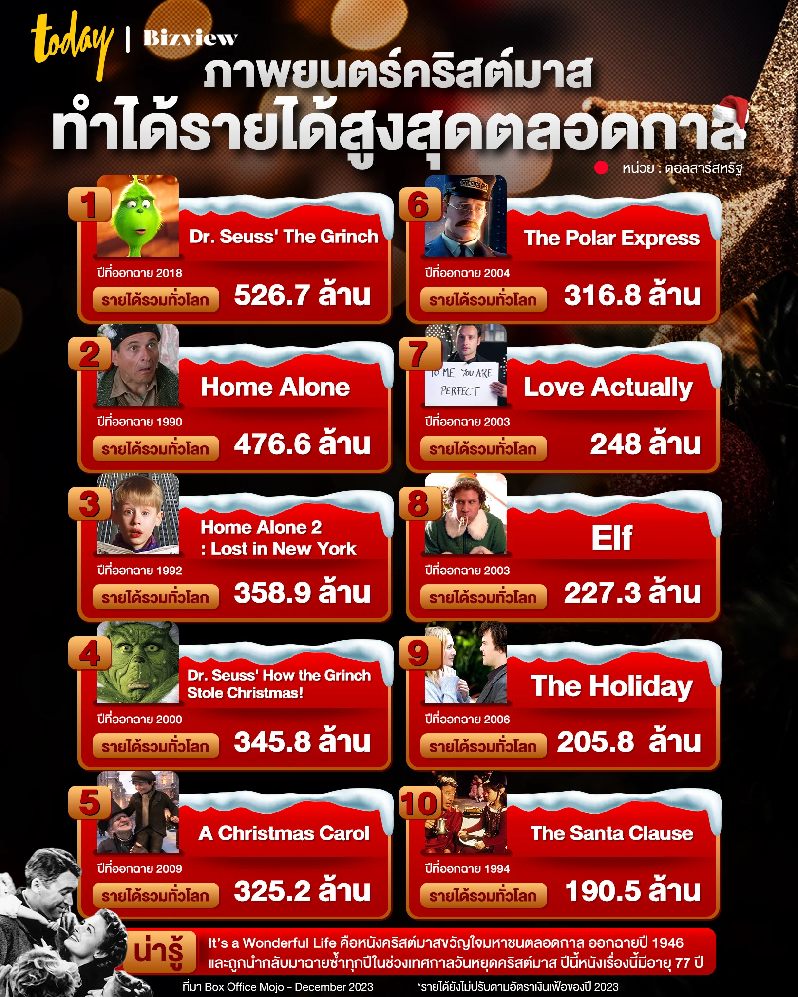 TODAY Bizview ได้รวบรวม 10 อันดับ หนังคริสต์มาสที่ทำรายได้ทั่วโลกสูงสุดตลอดกาล มาดูกันว่าหนังคริสต์มาสที่คนส่วนมากชอบ คือเรื่องอะไร หลายเรื่องเป็นหนังเก่าขึ้นหิ้งตั้งแต่ยุค 90 ที่ถ้าเทียบอิงตามอัตราเงินเฟ้อแล้วก็ยังคงติดอันดับเป็นหนังคริสต์มาสขวัญใจมหาชน