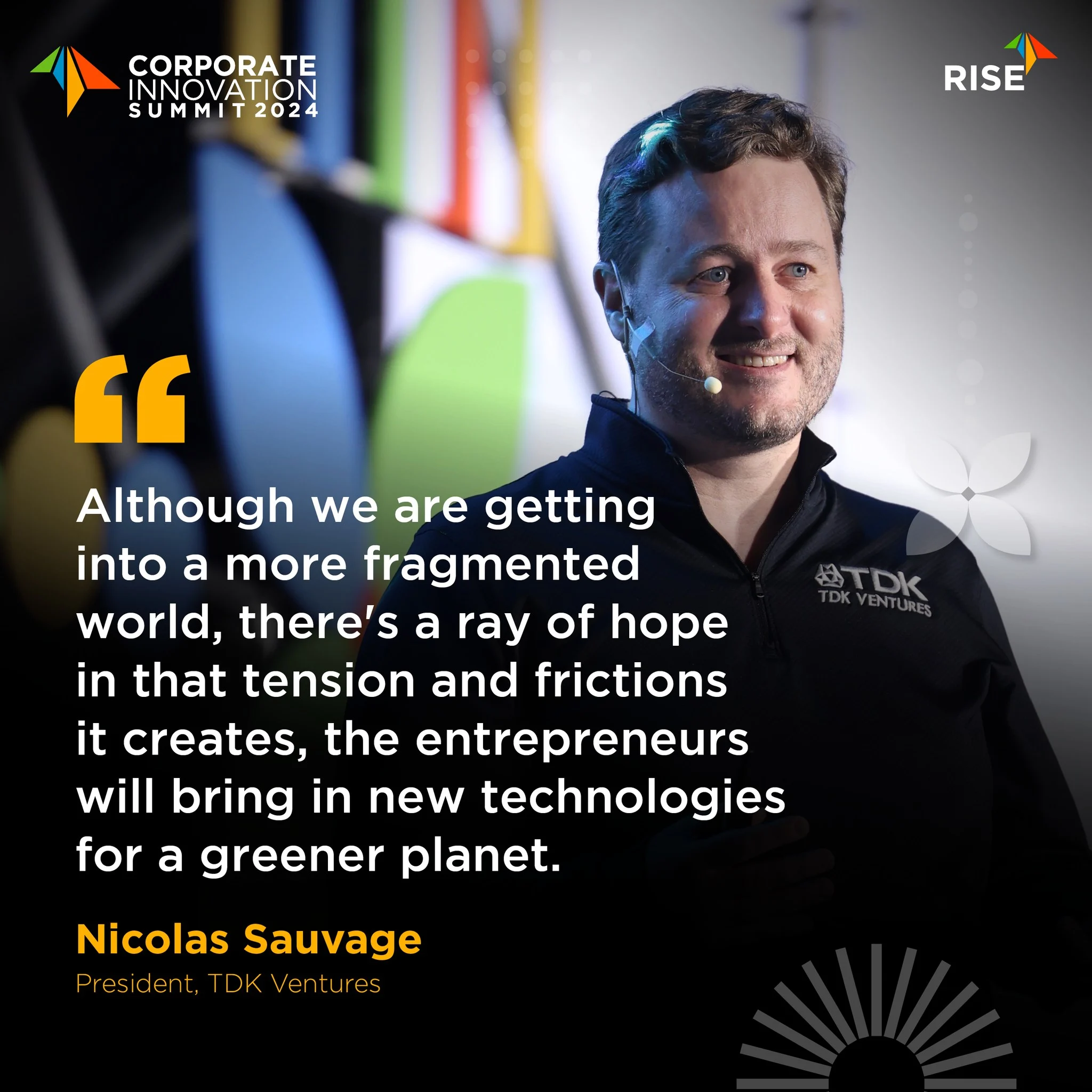 Nicolas Sauvage ประธานบริษัท TDK Ventures ที่ได้พูดถึงศักยภาพในการเปลี่ยนแปลงของเทคโนโลยีเชิงลึก (Deeptech) ว่ามีความน่าสนใจอย่างไร มีความสามารถในการแก้ปัญหาแบบเร่งด่วนอย่างไร ทั้งยังย้ำว่า นวัตกรรมสามารถขับเคลื่อนการเติบโตอย่างยั่งยืนได้ แน่นอนว่ามันไม่ใช่แค่ในภาคธุรกิจ แต่ยังในแง่ของสังคมด้วย