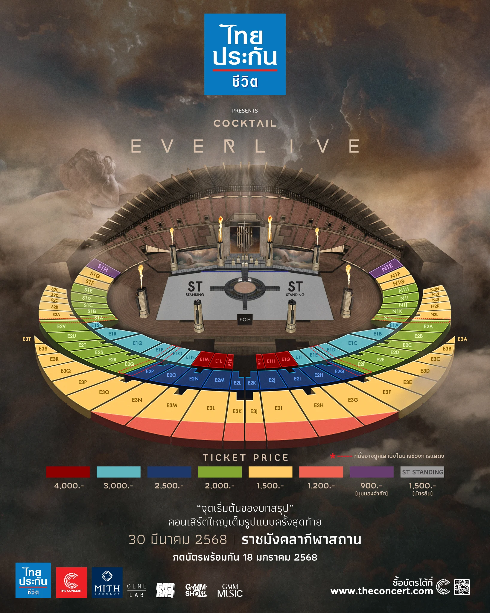 “ไทยประกันชีวิต presents COCKTAIL EVER LIVE” ชวนทุกคนมาจารึกประวัติศาสตร์ครั้งนี้ไปด้วยกัน ในวันอาทิตย์ที่ 30 มีนาคม 2568 ณ ราชมังคลากีฬาสถาน เปิดจำหน่ายบัตรวันเสาร์ที่ 18 มกราคม 2568 เวลา 10:00 น. เป็นต้นไป ที่ The Concert Application และเว็บไซต์ www.theconcert.com