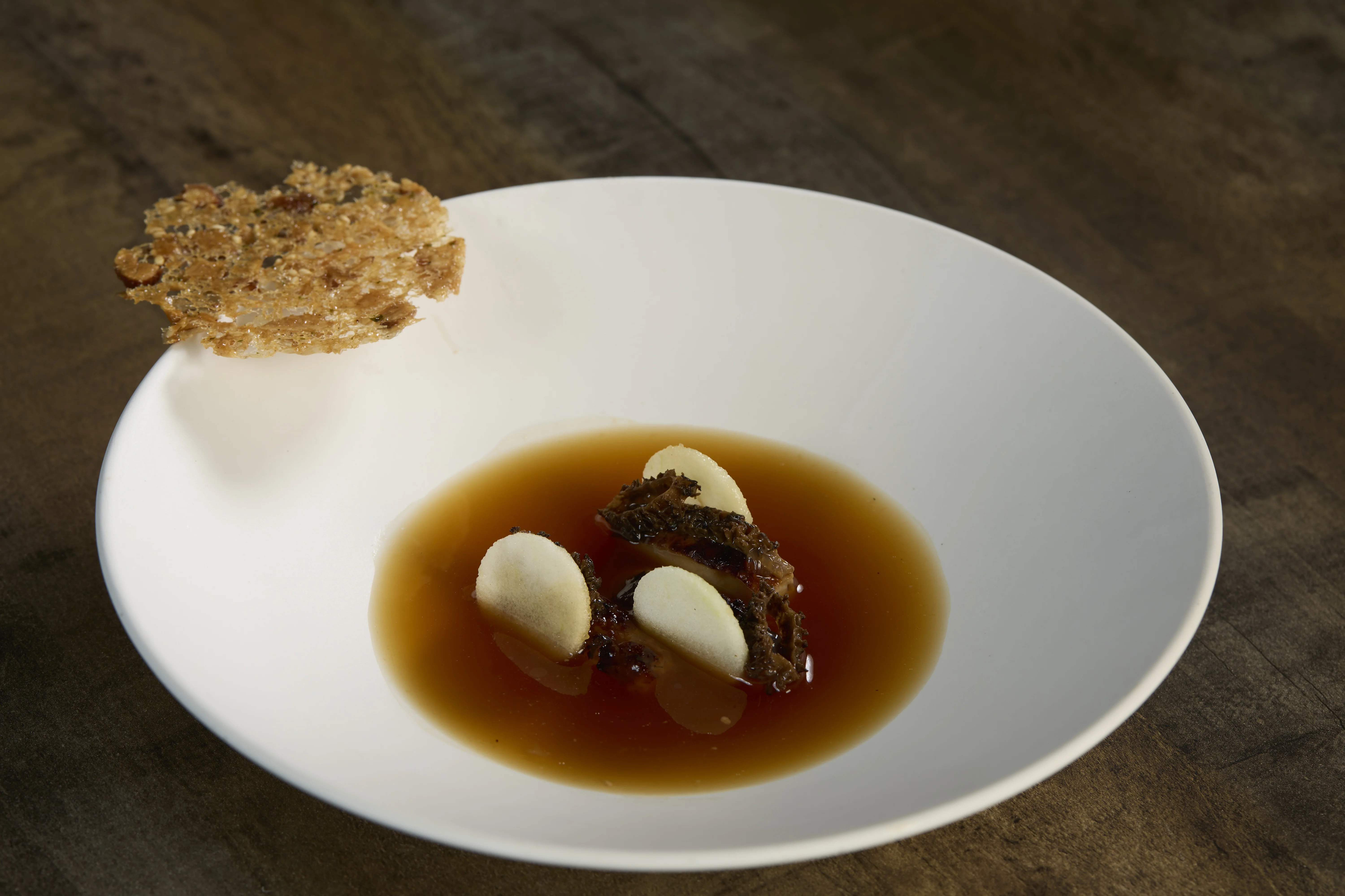 มื้ออาหารครั้งนี้คือการตีความรสชาติไทยในมิติใหม่ที่ผสานความร่วมสมัยอย่างประณีต อาทิ ขนมปังสอดไส้ไส้อั่ว ที่นำรสเผ็ดหอมแบบอีสานมาห่อในขนมปังโฮมเมดสูตรเฉพาะของเชฟแอม เพิ่มความละเมียดด้วยหมูไอเบริโกและฟัวกราส์ Swiss Soup ที่ได้แรงบันดาลใจจากซูเปอร์ตีนไก่แต่ปรับให้นุ่มละมุนด้วยอกไก่และเห็ด เสิร์ฟคู่ปาปาดัมข้าวบาร์เลย์กรอบบาง และความสนุกของ ส้มตำซอร์เบต์ ที่เปลี่ยนจานไทยคุ้นเคยให้สดชื่นด้วยมะละกอและกุ้งอะมาเอบิในรสเปรี้ยวหวานซับซ้อน