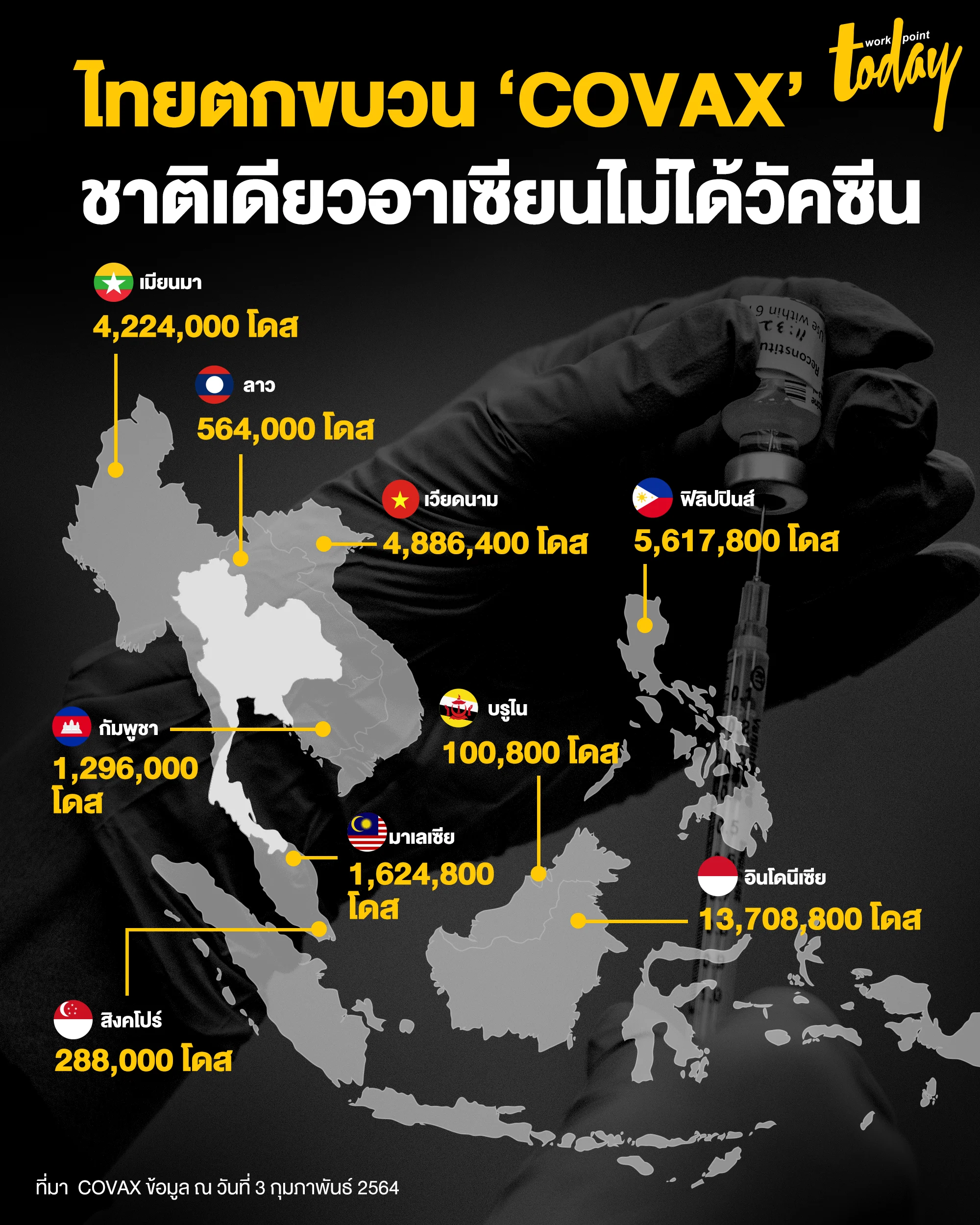 แต่ละประเทศอาเซียนได้วัคซีนโควิด-19 จากโคแวกซ์จำนวนเท่าไหร่บ้าง และทำไมไทยยังไม่อยู่ในกลุ่มที่จะได้รับวัคซีนจากโคแวกซ์ วันนี้ workpointTODAY สรุปเรื่องนี้มาให้อ่านกัน