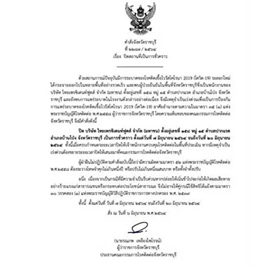 ขณะที่ นายรณภพ เหลืองไพโรจน์ ผู้ว่าราชการจังหวัดราชบุรี ได้ลงนามในหนังสือคำสั่งจังหวัดราชบุรี ที่ 2287/2564 เรื่อง ปิดสถานที่เป็นการชั่วคราว ด้วยสถานการณ์ปัจจุบันมีการระบาดของโรคติดเชื้อไวรัสโคโรนา 2019 (โควิด-19) ระลอกใหม่ ได้กระจายออกไปในหลายพื้นที่อย่างรวดเร็ว และพบผู้ป่วยยืนยันในพื้นที่ จ.ราชบุรี จึงมีเหตุจำเป็นเร่งด่วนเพื่อเป็นการป้องกันการแพร่ระบาด อาศัยอำนาจตามความในมาตรา 35 (1) แห่งพระราชบัญญัติโรคติดต่อ พ.ศ.2558 มีคำสั่งปิด บริษัท ไทยเพรชิเดนท์ฟูดส์ จำกัด (มหาชน) เป็นการชั่วคราว ตั้งแต่วันที่ 7 มิ.ย. 2564 จนถึงวันที่ 20 มิ.ย. 2564 รวม 14 วัน