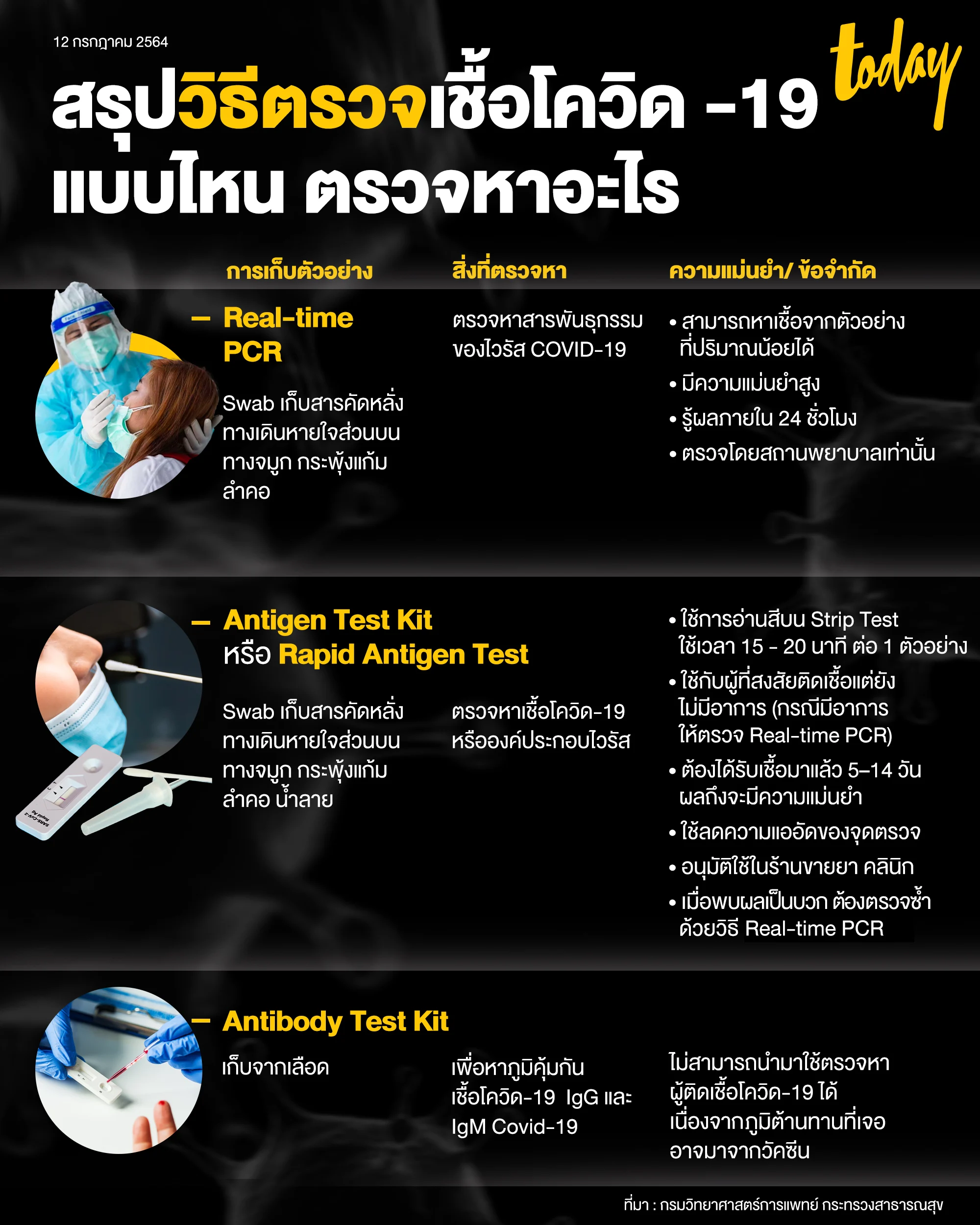 สรุปวิธีตรวจเชื้อโควิด 3 แบบ ได้แก่ Real-time PCR, Antigen Test Kit หรือ Rapid Antigen Test และ Antibody Test Kit ซึ่งเป็นวิธีตรวจหลักๆ ที่เราใช้กันตอนนี้ ว่ามีความแตกต่างอย่างไร ความแม่นยำ และข้อจำกัดแต่ละแบบเป็นอย่างไร