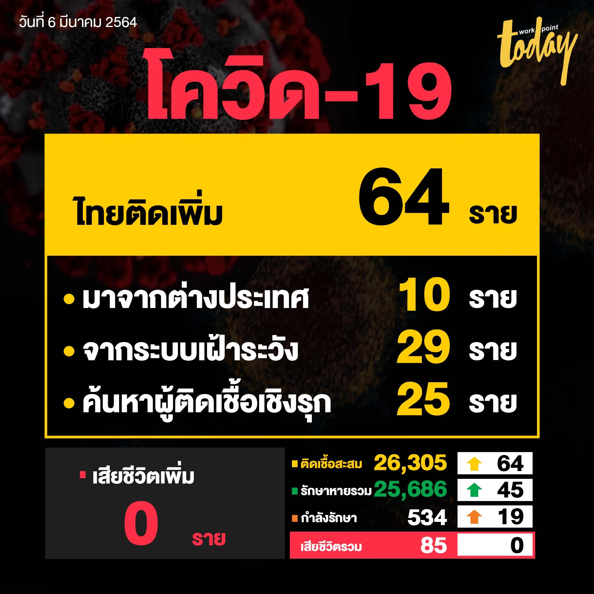 สถานการณ์แพร่ระบาดโควิด-19 ในไทยวันนี้มีรายงานผู้ติดเชื้อใหม่ 64 ราย จากระบบเฝ้าระวัง 29 ราย,คัดกรองเชิงรุก 25 ราย และ มาจากต่างประเทศและเข้า SQ 10 ราย ล่าสุดยอดติดเชื้อสะสมอยู่ที่ 26,305 ราย