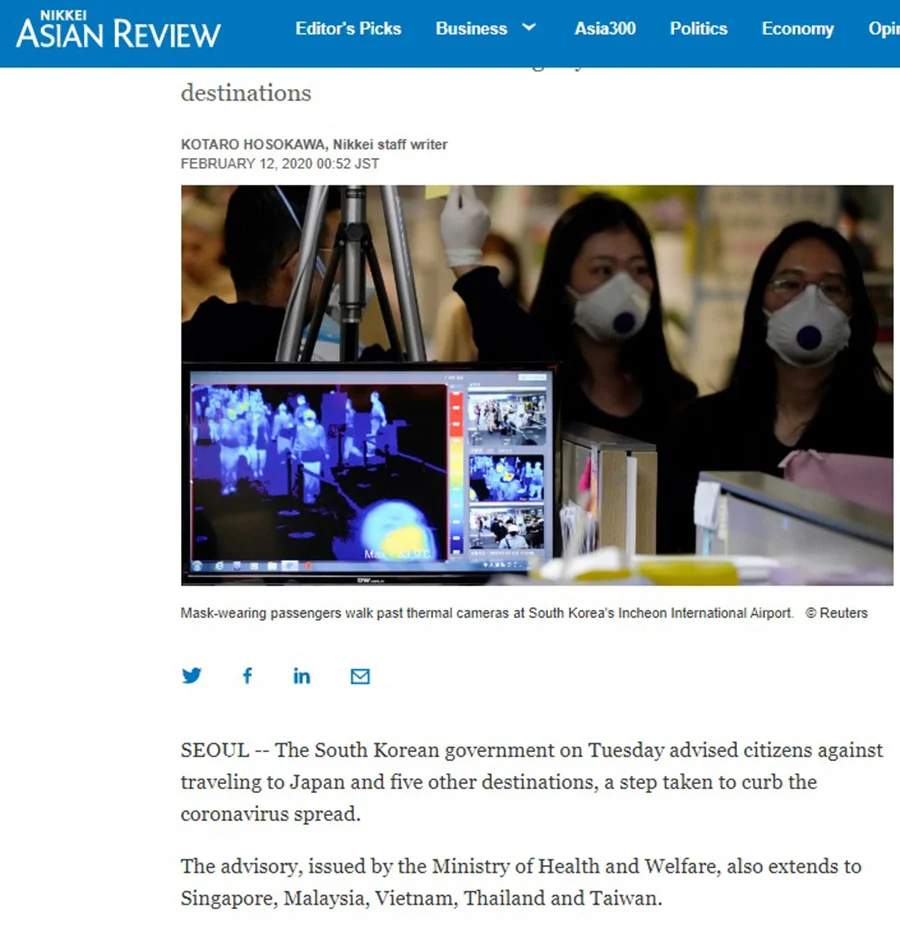 วันที่ 13 ก.พ.2563 เว็บไซต์ นสพ. Nikkei Asian Review ของญี่ปุ่น รายงานวานนี้ว่า กระทรวงสาธารณสุขและสวัสดิการของเกาหลีใต้ ออกประกาศเตือนและแนะนำพลเมืองของตน ว่าช่วงนี้ไม่ควรเดินทางไปยังกลุ่มประเทศที่อาจมีความเสี่ยงติดเชื้อไวรัสโควิด19 โดยระบุกลุ่มประเทศเสี่ยง ดังนี้ ญี่ปุ่น,สิงคโปร์, ไต้หวัน, เวียดนาม, มาเลเซีย และ ไทย