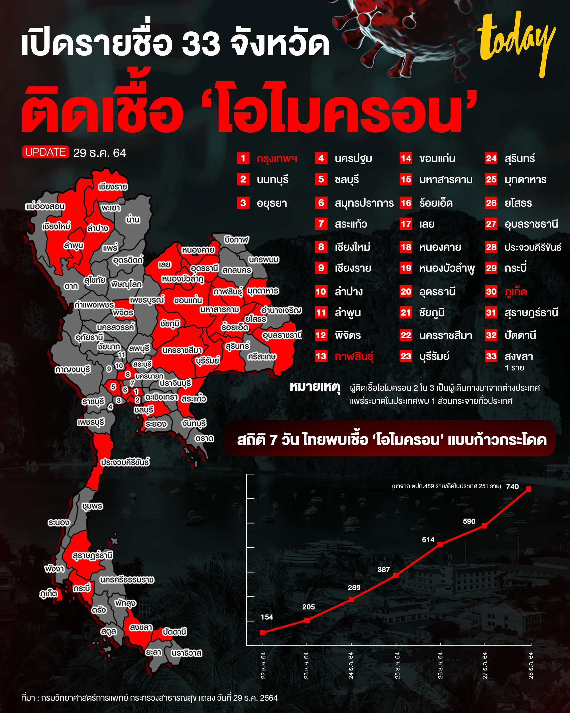 สธ. เผยไทยพบผู้ติดเชื้อโอไมครอนสะสม 740 ราย แพร่กระจายใน 33 จังหวัด ติดเชื้อผู้เดินทางมาจากต่างประเทศ 489 ราย และติดเชื้อภายในประเทศ 251 ราย จับตาคลัสเตอร์กาฬสินธุ์ และกรุงเทพมหานคร