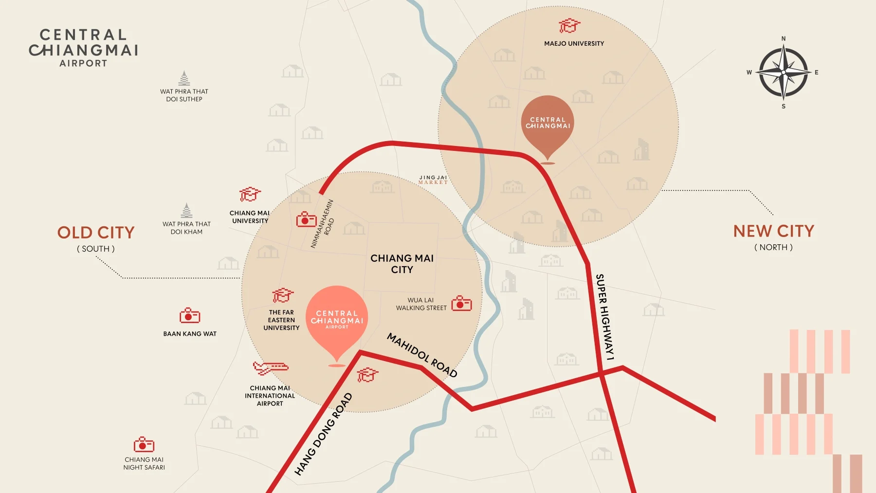 เซ็นทรัล เชียงใหม่ แอร์พอร์ต โฉมใหม่นี้ได้ยกระดับสู่การเป็นมิกซ์ยูสแลนด์มาร์กแห่งใหม่ ที่มีเป้าหมายดึงดูดทั้งนักท่องเที่ยวชาวไทยและต่างชาติ ออกแบบภายใต้คอนเซ็ปต์ ‘Reimagining Lanna’ นำอัตลักษณ์ล้านนามาดีไซน์ในสไตล์ Modern เล่าเรื่องเชื่อมเมืองเชียงใหม่อย่างร่วมสมัย บนพื้นที่โครงการกว่า 130 ไร่