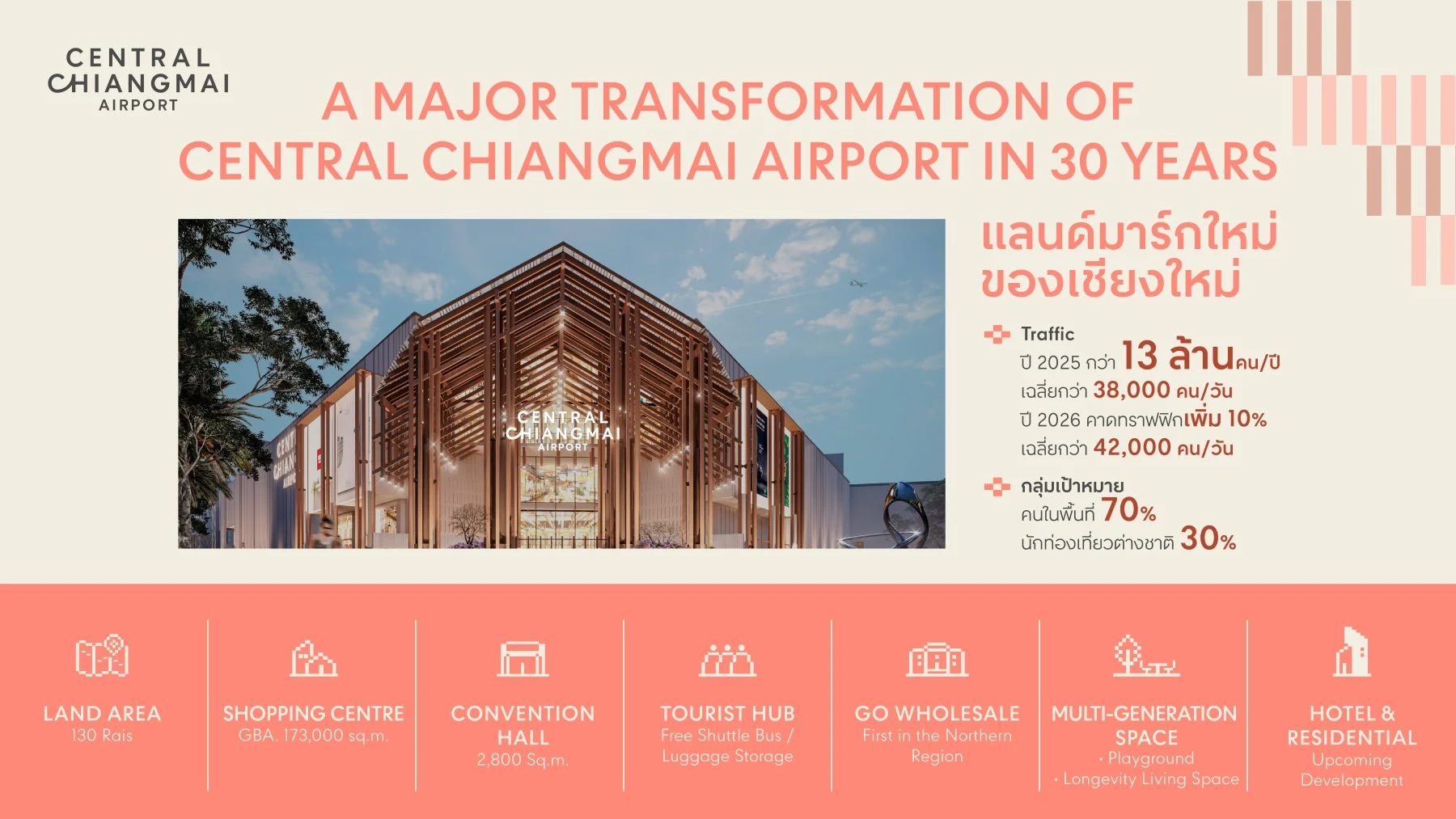 การปรับโฉมและพัฒนาเซ็นทรัล เชียงใหม่ แอร์พอร์ต จึงเป็นการตอบรับดีมานด์ใหม่ของเมือง จากที่ผ่านมาในปี 2568 เซ็นทรัล เชียงใหม่ แอร์พอร์ต มีทราฟฟิกรวมกว่า 13 ล้านคนต่อปี หรือเฉลี่ยประมาณ 38,000 คนต่อวัน และคาดว่าในปี 2569 ตัวเลขดังกล่าวจะเพิ่มขึ้นเป็นราว 42,000 คนต่อวัน ตั้งเป้ากลุ่มเป้าหมายเป็นคนไทย 70% และนักท่องเที่ยวต่างชาติ 30%