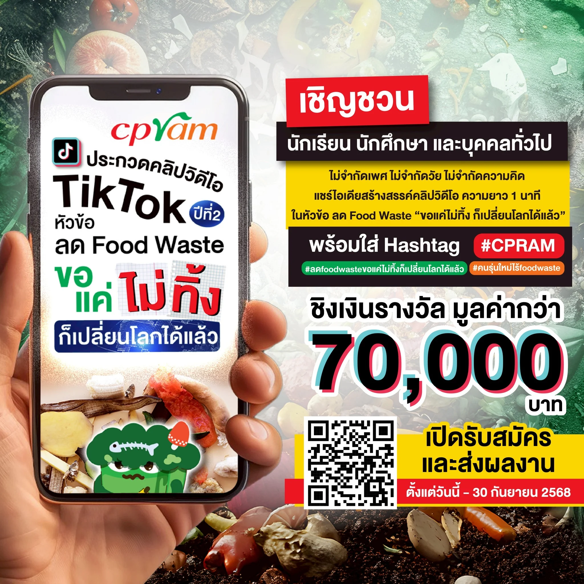 บริษัท ซีพีแรม จำกัด (CPRAM) ผู้นำด้านอุตสาหกรรมอาหารพร้อมรับประทาน สานต่อเจตนารมณ์การพัฒนาสังคมอย่างยั่งยืน เดินหน้าภารกิจเพื่อสิ่งแวดล้อมอย่างต่อเนื่อง จัดกิจกรรมประกวดคลิปวิดีโอ TikTok ความยาว 1 นาที ภายใต้หัวข้อ “ขอแค่ไม่ทิ้ง ก็เปลี่ยนโลกได้แล้ว” เปิดพื้นที่ให้ประชาชนทั่วไปได้ร่วมเป็นส่วนหนึ่งในการสร้างความเปลี่ยนแปลงผ่านแนวคิดลดขยะอาหาร (Food Waste) อย่างง่าย ๆ ได้ด้วยตัวคุณเอง พร้อมชิงเงินรางวัลรวมกว่า 70,000 บาท พร้อมใบประกาศเกียรติคุณ เปิดรับสมัครและส่งผลงานได้ตั้งแต่วันนี้ – 30 กันยายน 2568