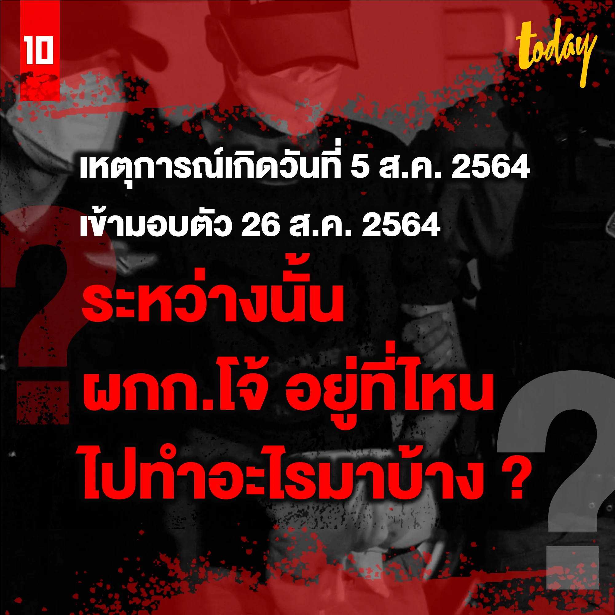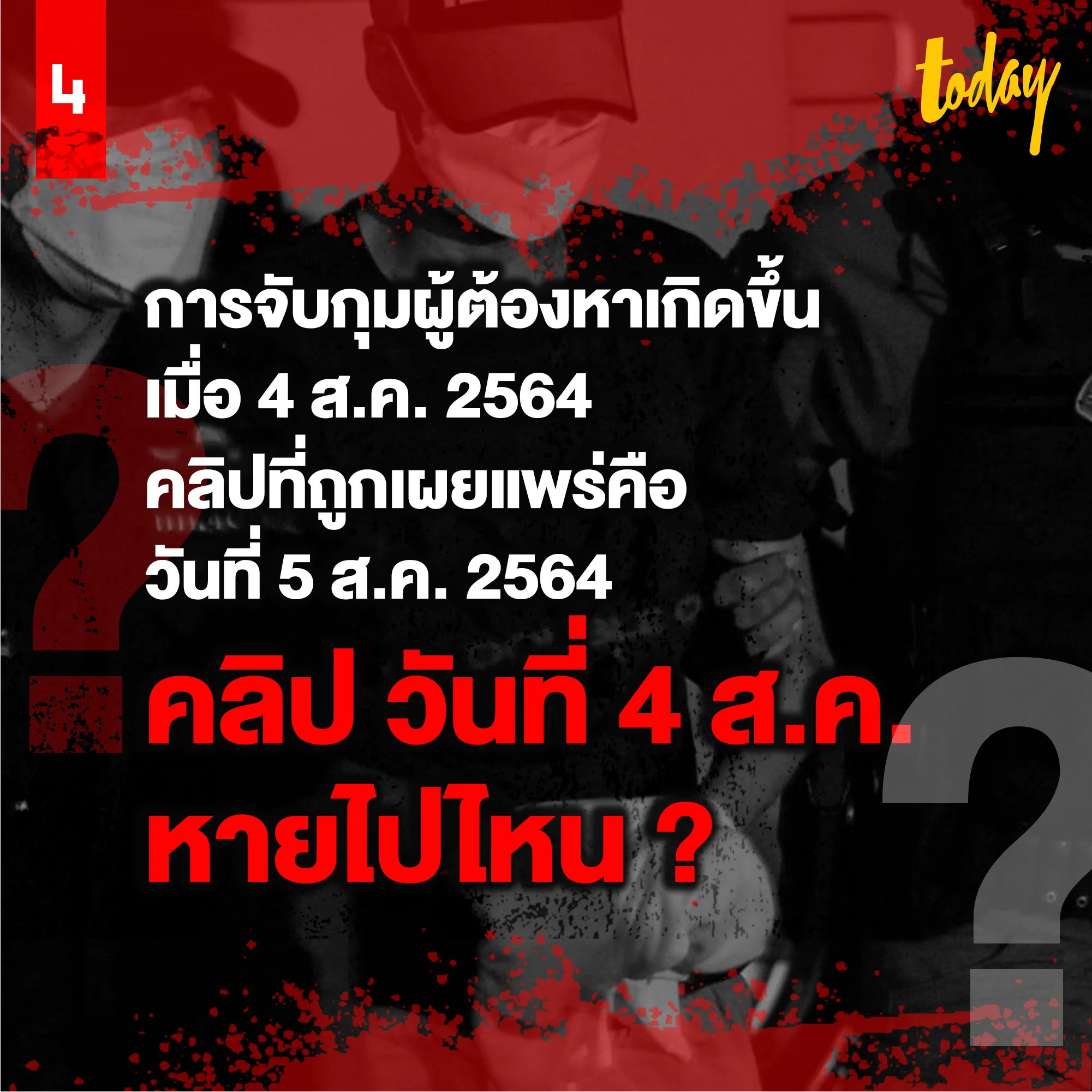4. การจับกุมผู้ต้องหาเกิดขึ้นเมื่อ 4 ส.ค. 2564 คลิปที่ถูกเผยแพร่คือวันที่ 5 ส.ค. 2564 คลิป วันที่ 4 ส.ค. หายไปไหน