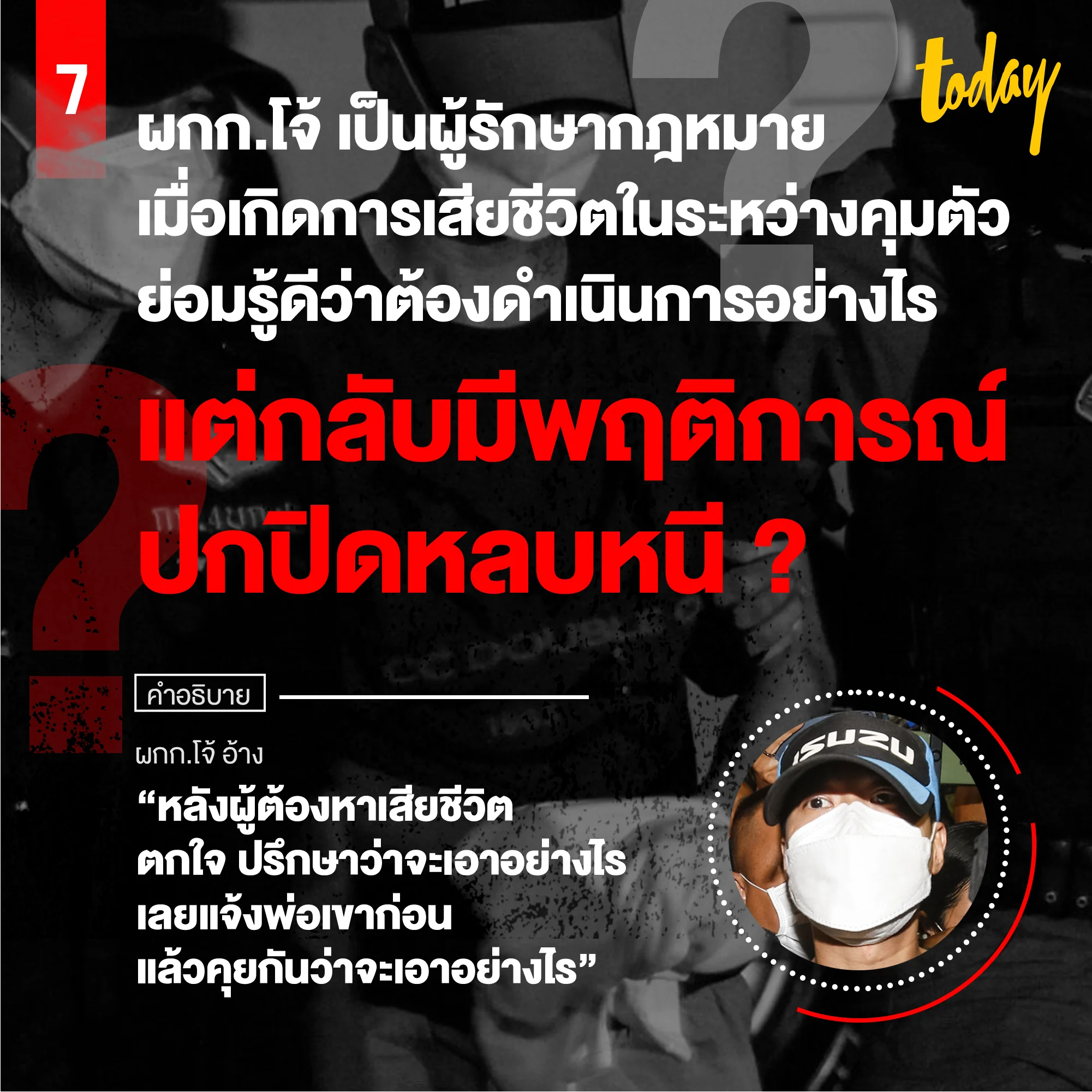 7. ผกก.โจ้ เป็นผู้รักษากฎหมาย เมื่อเกิดการเสียชีวิตในระหว่างคุมตัว ย่อมรู้ดีว่าต้องดำเนินการอย่างไรแต่กลับมีพฤติการณ์ปกปิดหลบหนี
