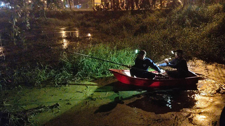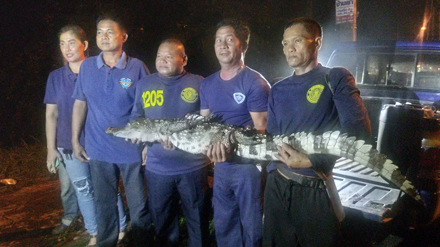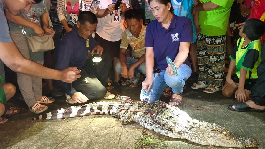 สบายใจได้แล้ว! ประมงนำทีมล่าจระเข้น้ำจืดจับจระเข้ยาว 2 เมตร หลังชาวปราจีนพบในแอ่งน้ำข้างทางบริเวณ ต.เมืองเก่า อ.กบินทร์บุรี จ.ปราจีนบุรี ตรวจสอบพบจระเข้าถูกรถยนต์ทับบริเวณหาง