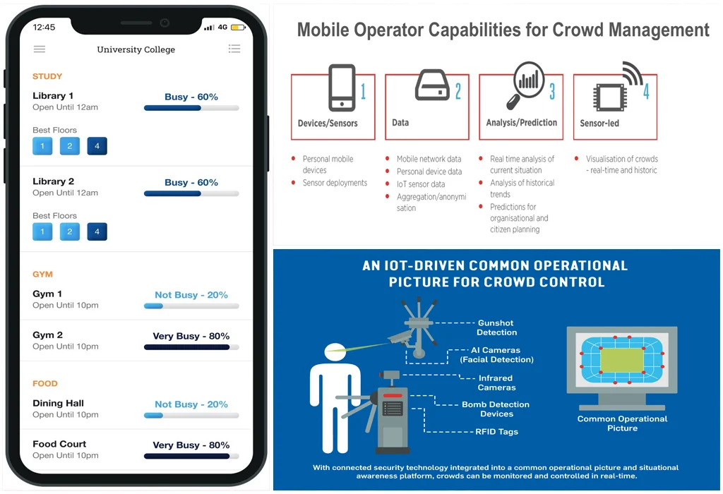 3. เลือกใช้เทคโนโลยีในการจัดการฝูงชน Crowd Management อย่างเหมาะสม ทั้งระบบ Security และ Monitor เชื่อมโยงกับอุปกรณ์ IoT ระแวดระวังเหตุ เช่น ให้ผู้มาร่วมงานดาวน์โหลด Application ของงานหรือลงทะเบียนทราบประวัติสุขภาพของแต่ละคนล่วงหน้า, การจัดที่นั่งแบบระบุหมายเลขและโซน จะลดการวิ่งกรูของฝูงชนเข้าเพื่อแย่งชิงที่นั่งดีๆ ซึ่งอาจเกิดอุบัติเหตุได้, การผูก tag/RFID ที่ข้อมือทุกคนที่เข้าร่วมงานเพื่อสามารถระบุตำแหน่ง และสามารถวัดปริมาณความหนาแน่นของแต่ละพื้นที่ไม่ให้เกินจุดปลอดภัย, การตรวจว่าจุดใดมีคนหนาแน่นเกินขีดอันตรายอาจตรวจสอบได้จากข้อมูลเครือข่ายมือถือ คล้ายการดูข้อมูลรถติดจาก Google Map ประชาชนมักมี Smart Phone ติดตัว ในงานอีเว้นท์ซึ่งไม่มีเจ้าภาพ ทางท้องถิ่นหรือจังหวัดอาจใช้ Application ของท้องถิ่นนั้นให้ข้อมูลของอีเว้นท์ แจ้งแผนที่ที่คนแน่นเกินขีดจำกัด, การแสดงภาพ CCTV, ภาพจากโดรน แบบ Real-Time บริเวณงานและวิเคราะห์จุดเสี่ยง
