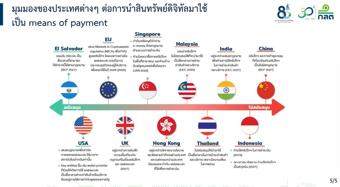 นายเศรษฐพุฒิ สุทธิวาทนฤพุฒิ ผู้ว่าการ ธปท. กล่าวว่า ธปท. คำนึงถึงทั้งความเสี่ยงและประโยชน์ของสินทรัพย์ดิจิทัล รวมถึงเทคโนโลยีเบื้องหลัง และมองว่า ณ ขณะนี้การนำสินทรัพย์ดิจิทัลมาใช้เป็นสื่อกลางในการชำระค่าสินค้าและบริการอย่างแพร่หลายจะทำให้เกิดความเสี่ยงต่อระบบเศรษฐกิจการเงินของประเทศ จึงควรมีการกำกับดูแลที่ชัดเจน ขณะที่เทคโนโลยีและสินทรัพย์ดิจิทัลบางประเภทที่ไม่ก่อให้เกิดความเสี่ยงดังกล่าวก็ควรได้รับการสนับสนุนโดยมีกลไกดูแลที่เหมาะสม เพื่อให้เกิดนวัตกรรมและประโยชน์ต่อประชาชน