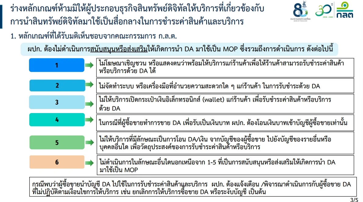 ธปท. ก.ล.ต. และกระทรวงการคลัง ร่วมกันกำหนดแนวทางกำกับดูแล ห้ามไม่ให้ผู้ประกอบธุรกิจสินทรัพย์ดิจิทัลให้บริการเกี่ยวกับการนำสินทรัพย์ดิจิทัลมาใช้เป็นสื่อกลางในการชำระค่าสินค้าและบริการอย่างแพร่หลาย พร้อมเปิดรับฟังความเห็น 25 ม.ค. – 8 ก.พ.นี้