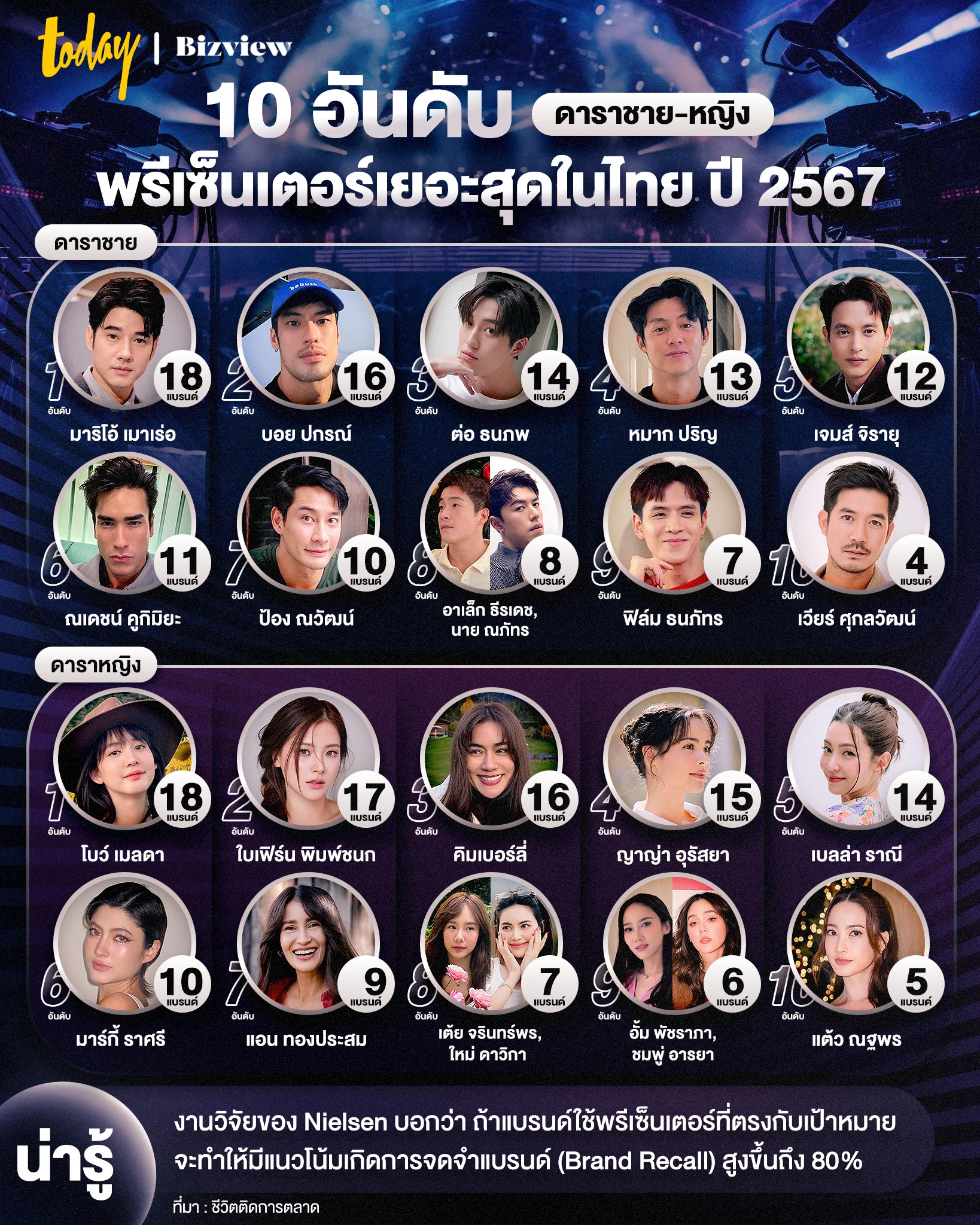 TODAY Bizview ชวนส่อง 10 อันดับ ‘ดาราชาย-หญิง’ พรีเซ็นเตอร์เยอะสุดในไทยปี 2567